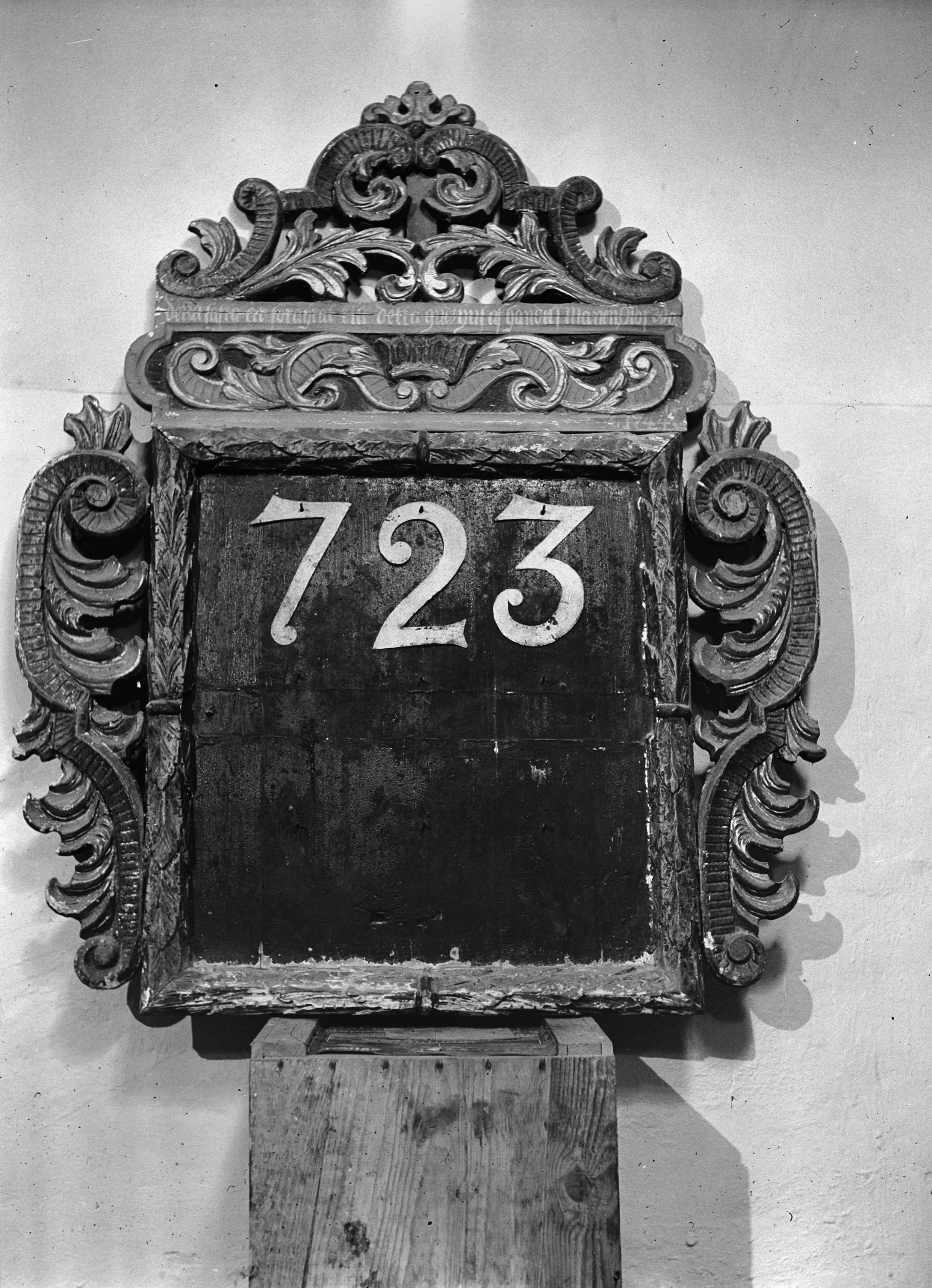 Beskrivning: Nummertavla av trä. På ramen snidade blad. Upptill och på sidorna genombrutna bladornament i rött, guld, blått och silver. 1700-talet. Före restaurering.