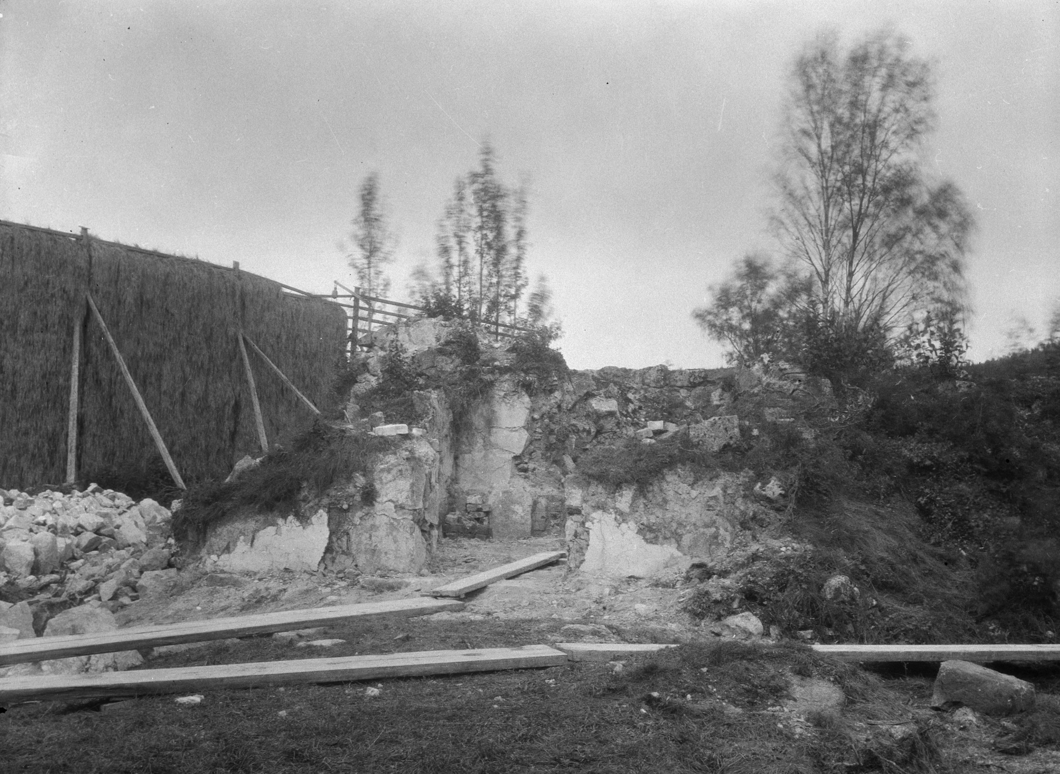 Beskrivning: Ruinen från söder. Vapenhuset utgrävt.
