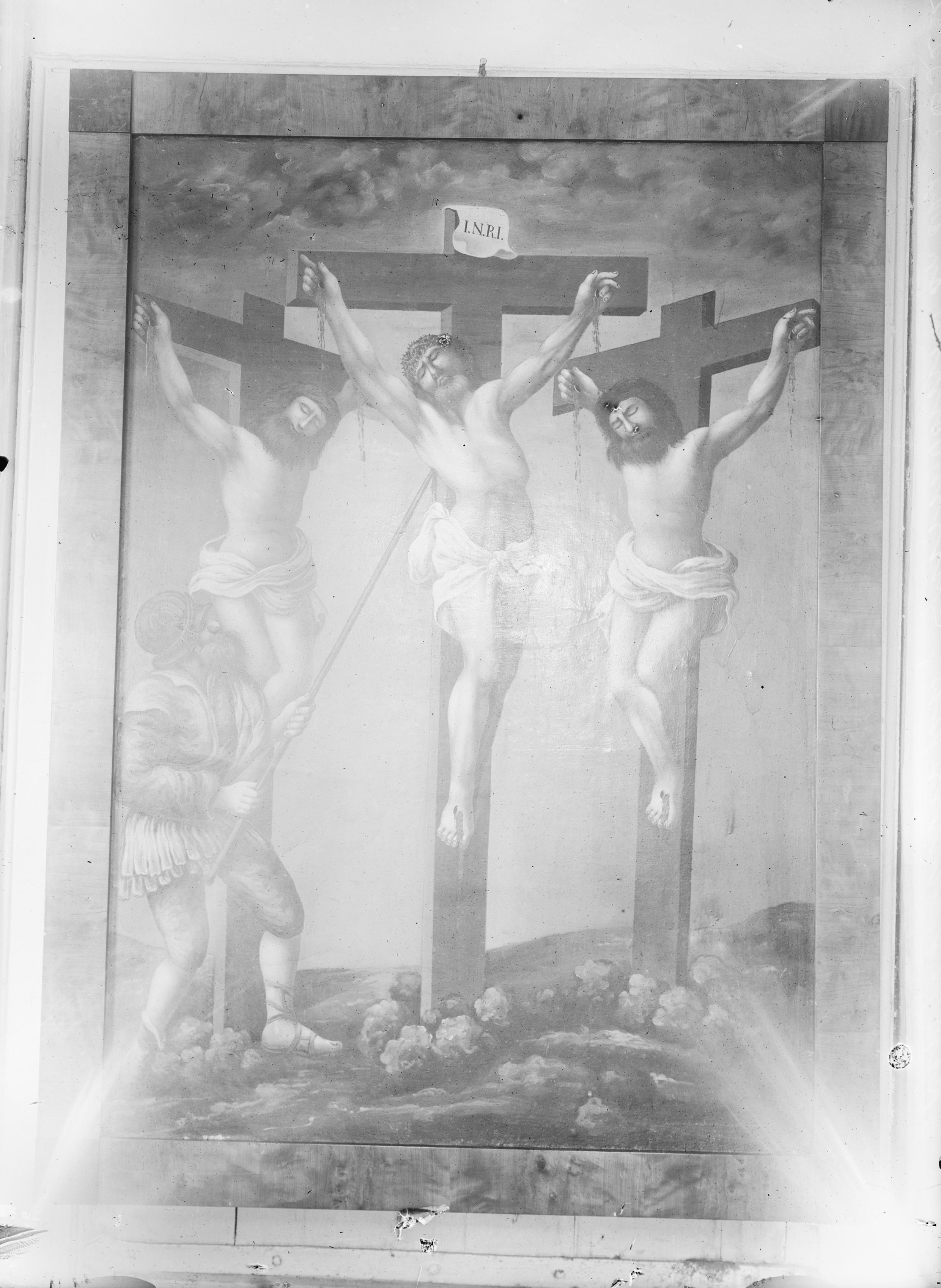 Beskrivning: Oljemålning på papper, uppklistrad på duk. Kristus på korset mellan de båda rövarna. Ram i björkfaner. 134 x 93 cm. 1700-talet. Snabbinventering.