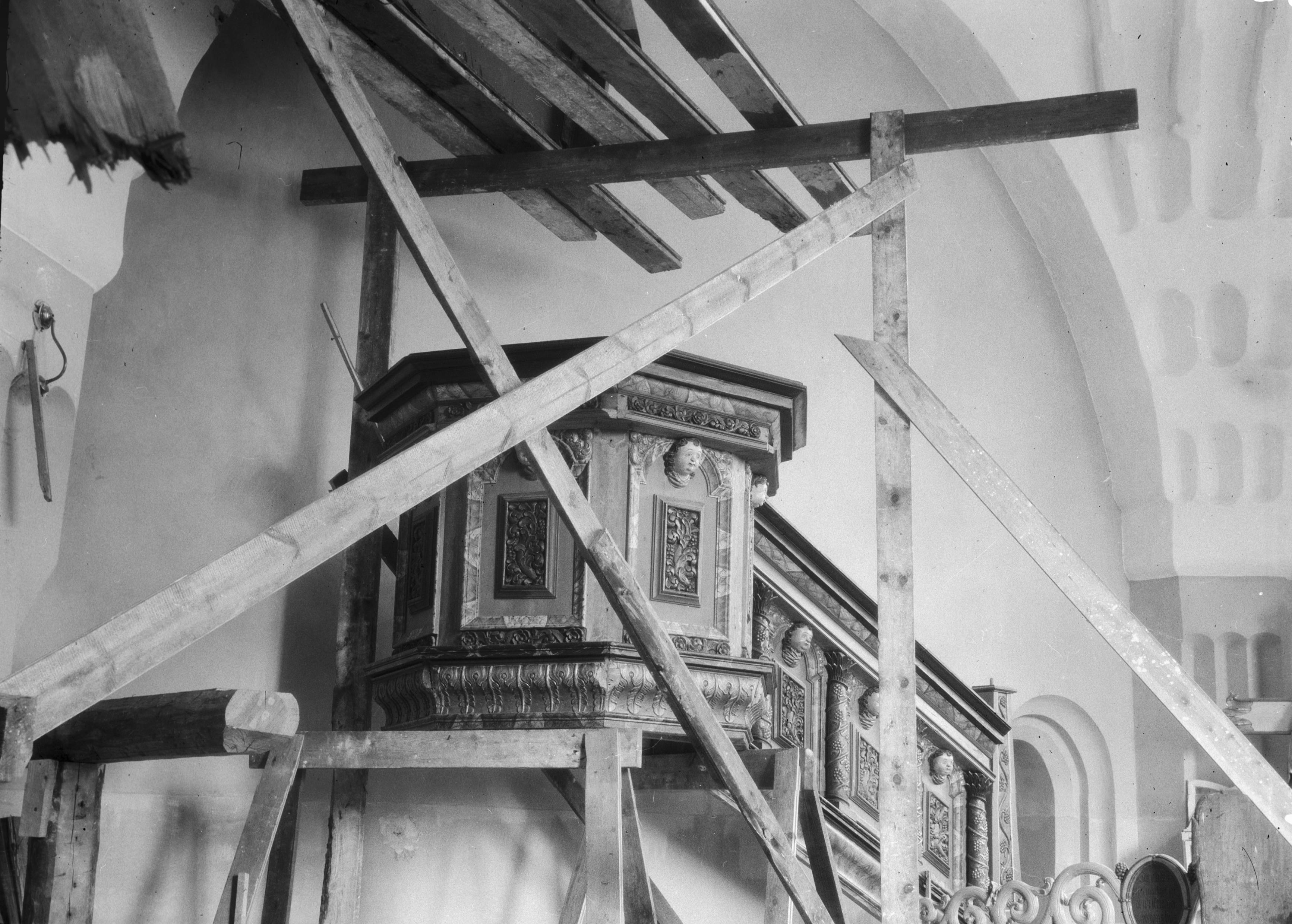 Beskrivning: Predikstol, under uppsättning. Femsidig, i hörnen kolonetter med vindruvsranka. Nischerna innehåller bladornament och har änglahuvuden upptill. 1600-talet, snabbinv.