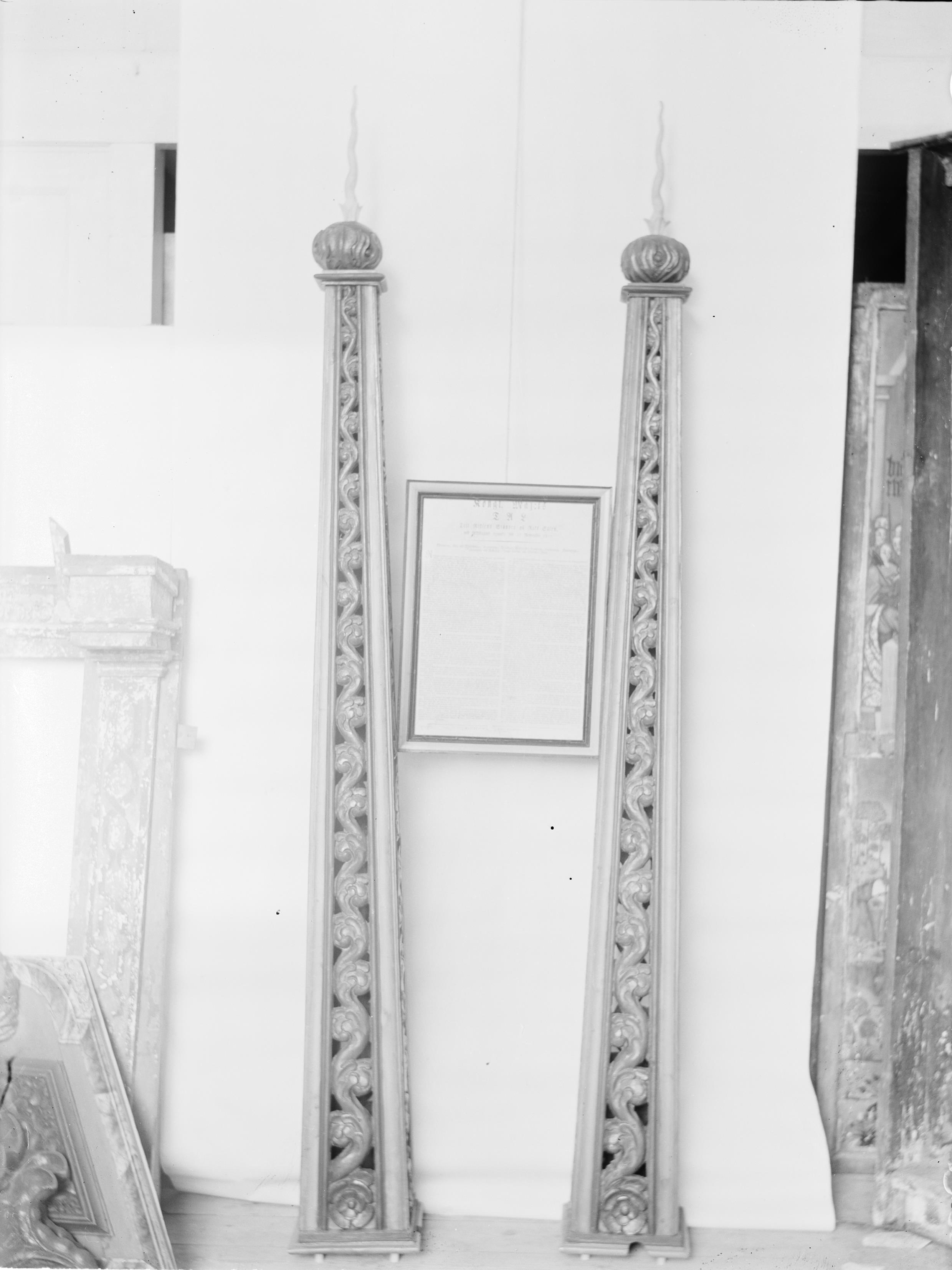 Beskrivning: Pyramider, av trä. Två stycken. Snidade genombrutna bladornament. Omkring 1700, snabbinv. Efter konservering 1931.