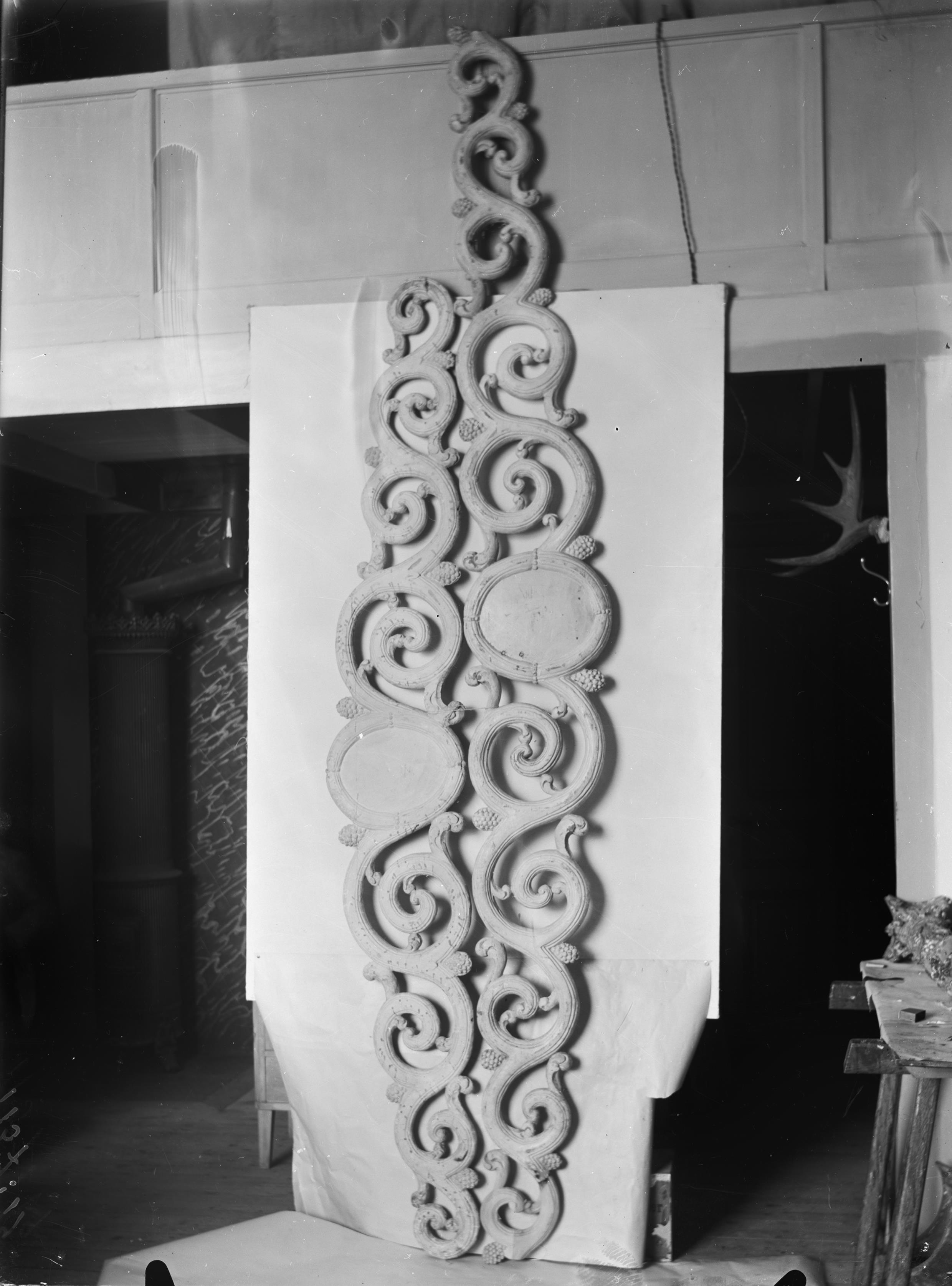 Beskrivning: Korskrank, av trä. Två stycken. S-formade bladornament med druvklasar. Omkring 1700, snabbinv. Före konservering.