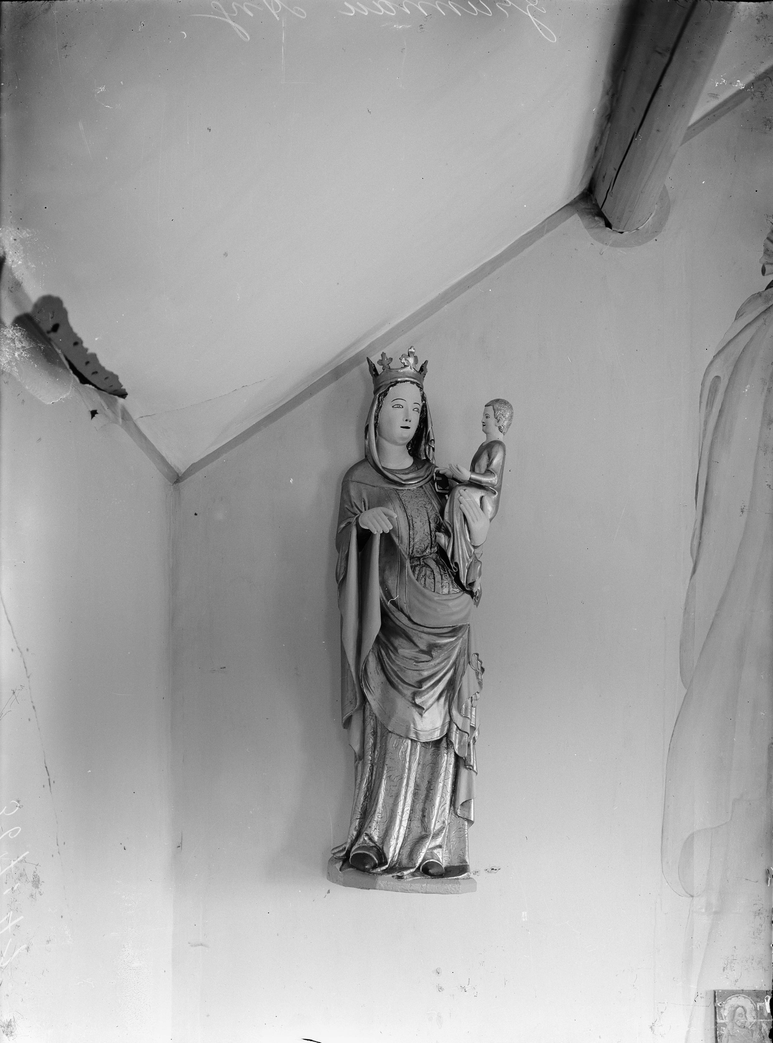 Beskrivning: Madonna, träskulptur. Bär barnet på vänsterarmen, på huvudet krona. Ny färg och förgyllning från 1908. 1300-talet, snabbinv.