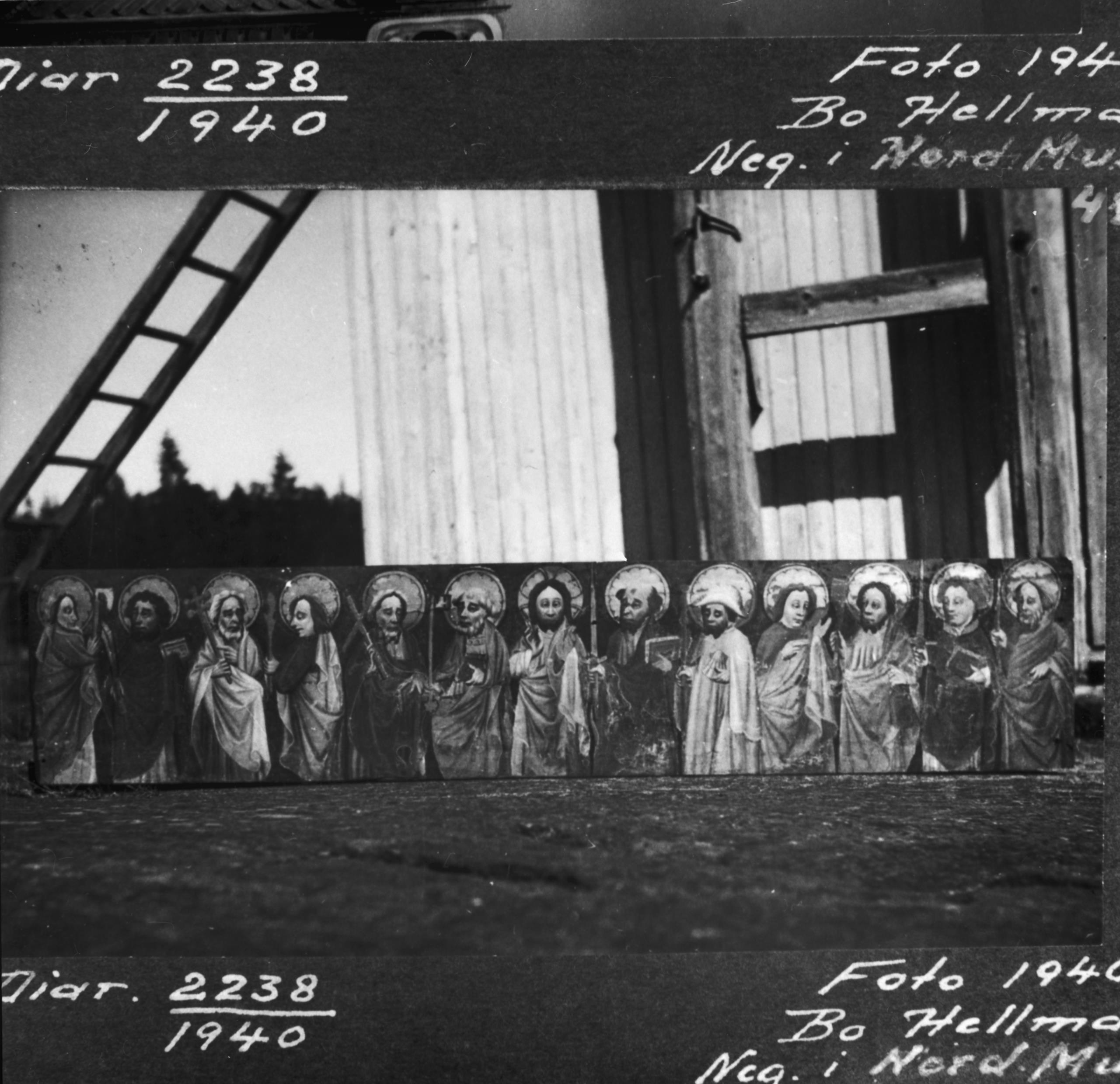 Beskrivning: Predella till altarskåp. Träskiva med Kristus och apostlarna i målning. Omkring 1500, snabbinv.