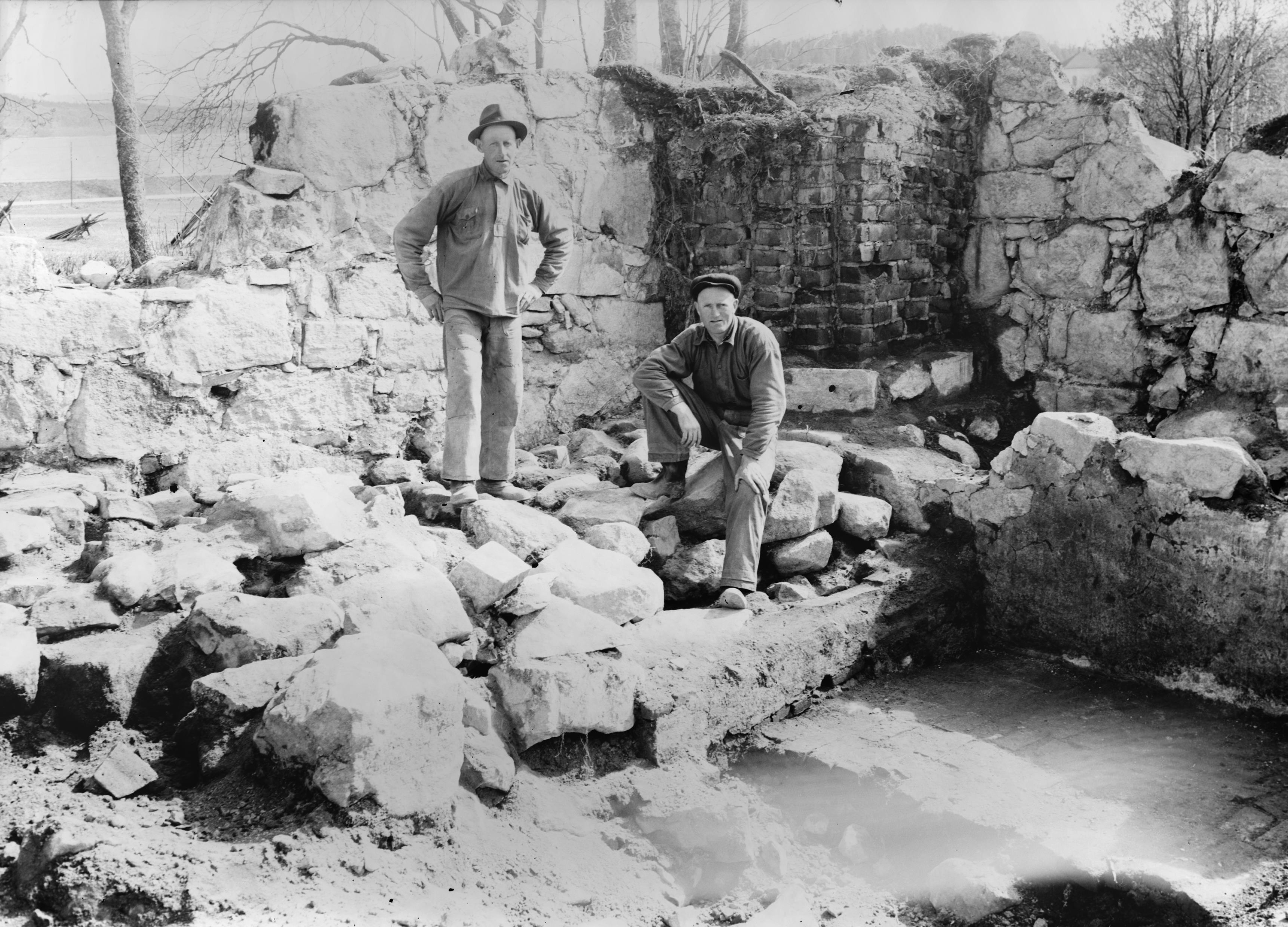 Beskrivning: Kyrkoruinens inre. Sydöstra hörnet. Under restaurering.