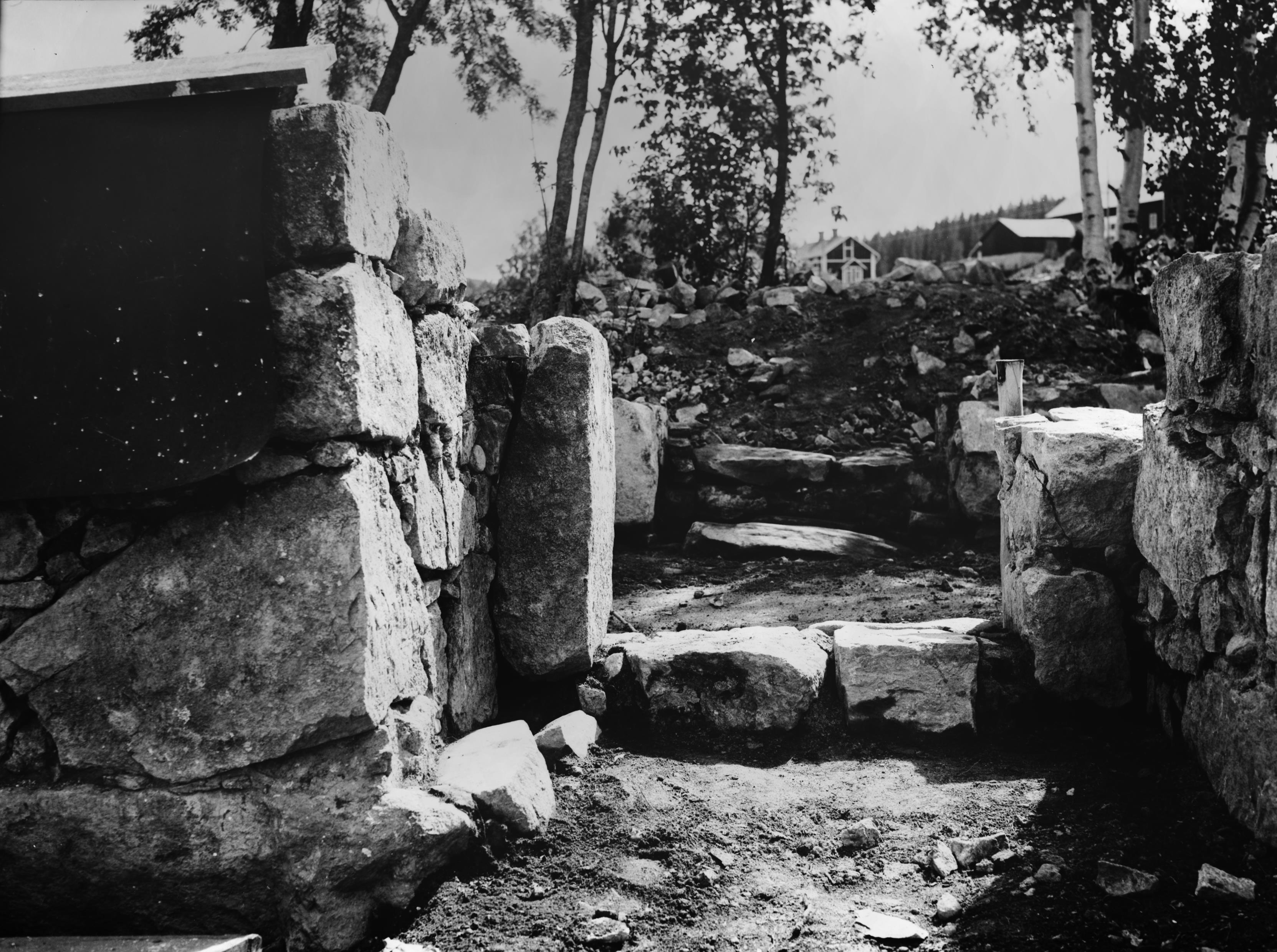 Beskrivning: Kyrkoruinen, ingången, sedd från ruinens inre. Under restaureringen.