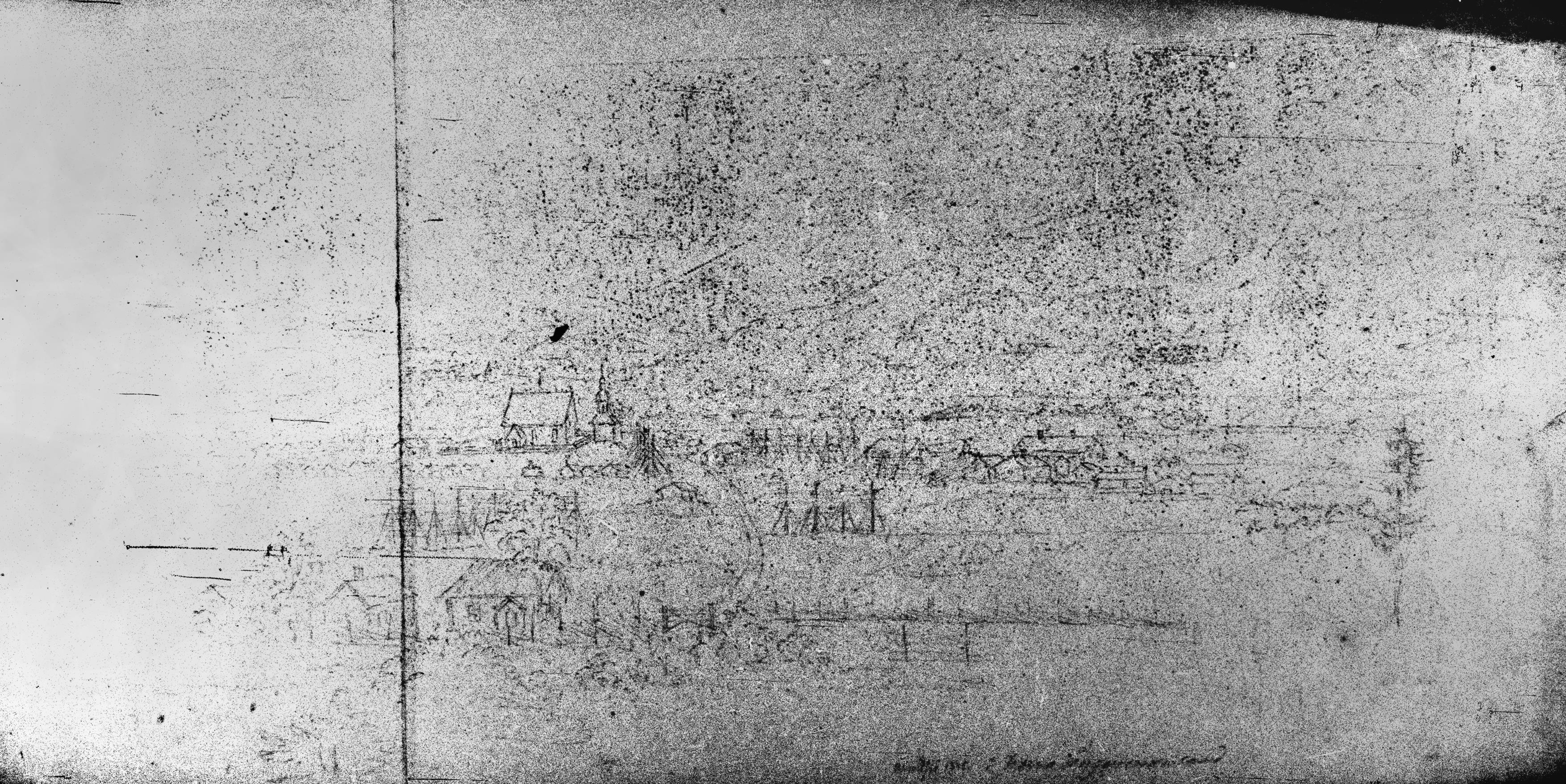 Beskrivning: Fotograferad skiss. Kyrkan från söder med omnejd. Ur C J F Plagemanns resor, nr 3. 1845