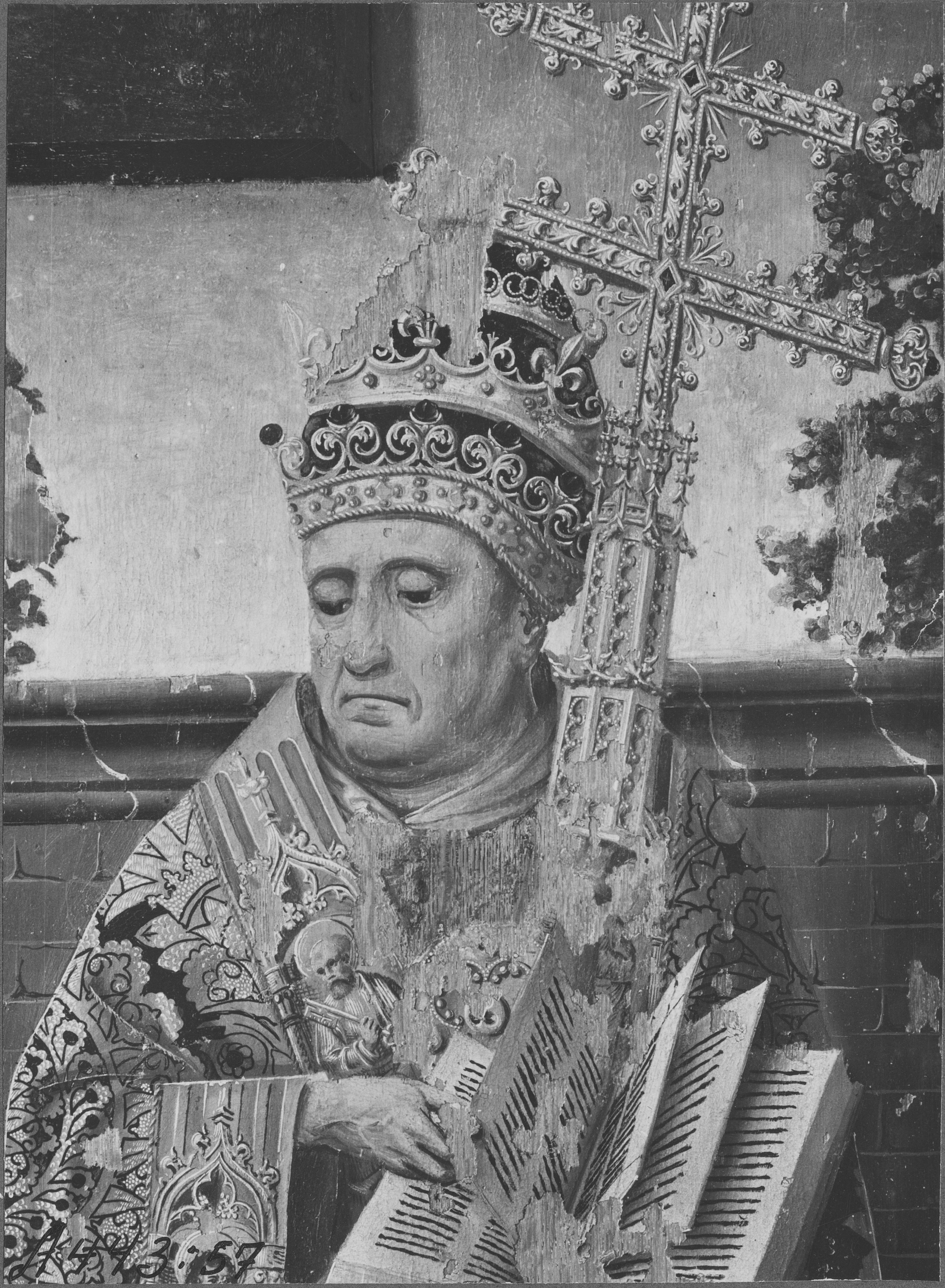 Beskrivning: Altarskåp av ek. Tillverkad i Brysselverkstad. Från 1500-talets första fjärdedel. Skåpets utsida, detalj.