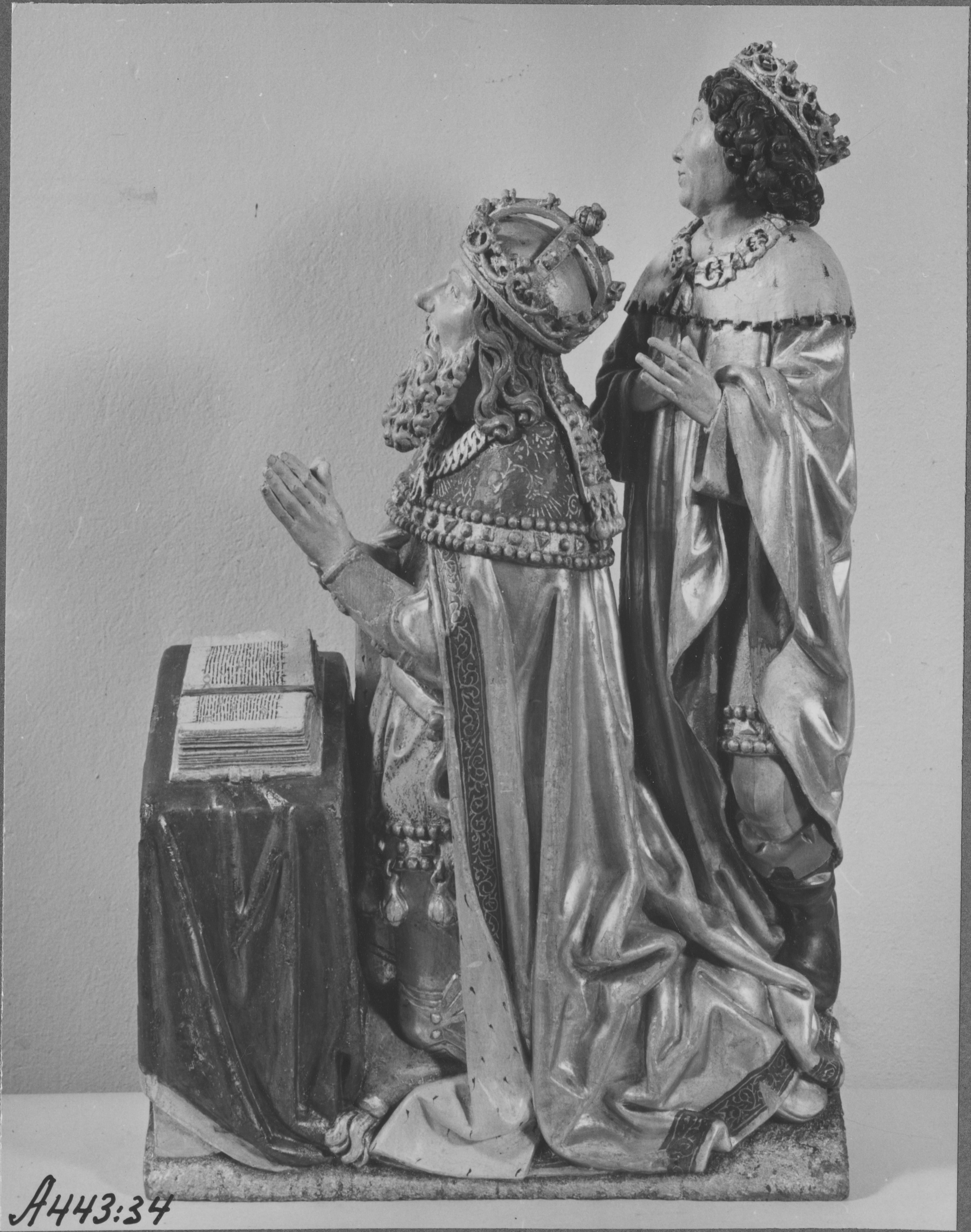 Beskrivning: Altarskåp av ek. Tillverkad i Brysselverkstad. Från 1500-talets första fjärdedel. Detalj, träfigurer, ur gruppen Marias förhärligande.