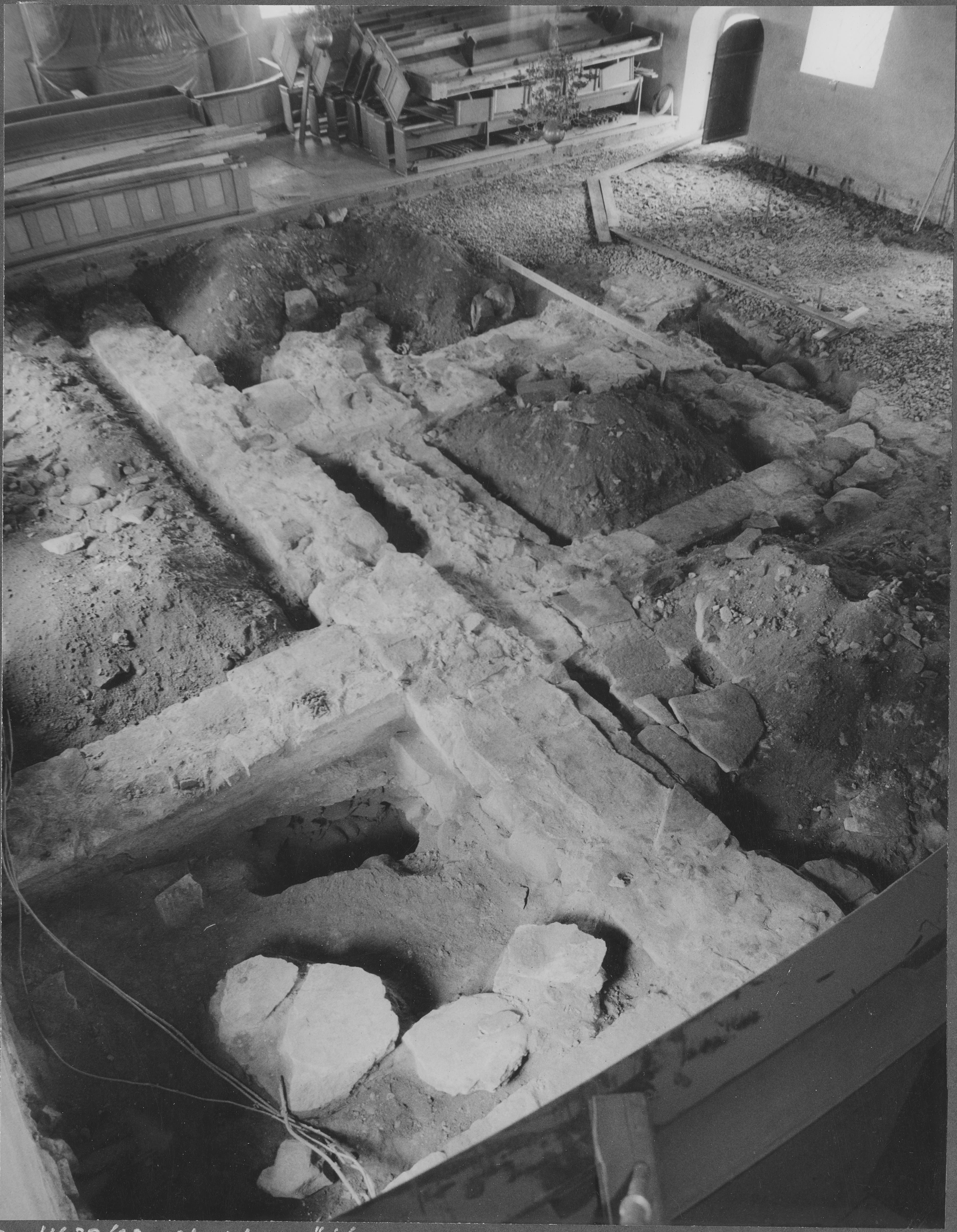 Beskrivning: Norra sidans äldre grundmurar från N.V. Nedtill sakristian och i mitten äldsta korpartiet.