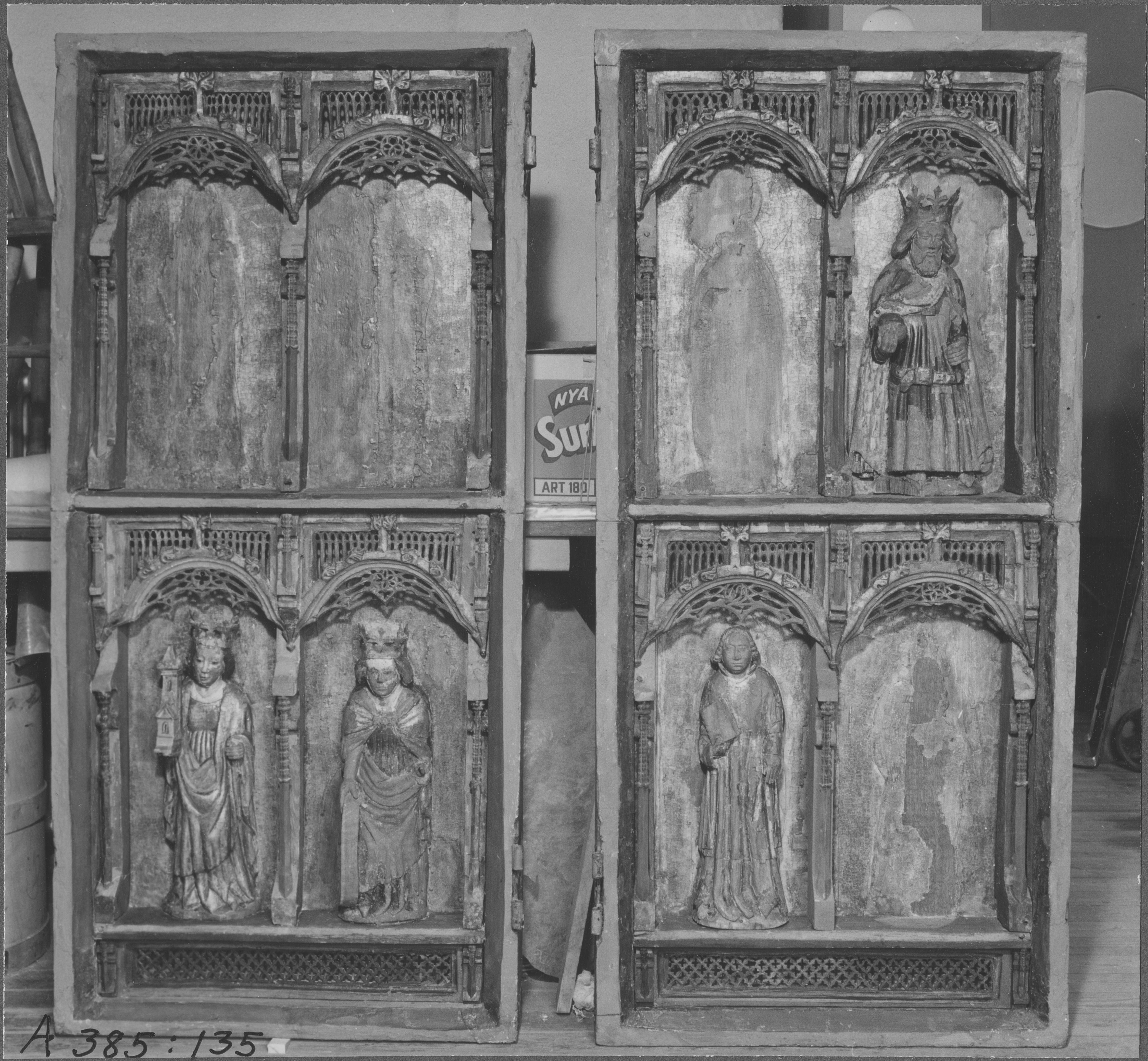 Beskrivning: Altarskåp. Efter konservering. S Katarina, S Barbara och S Olof samt en apostel.