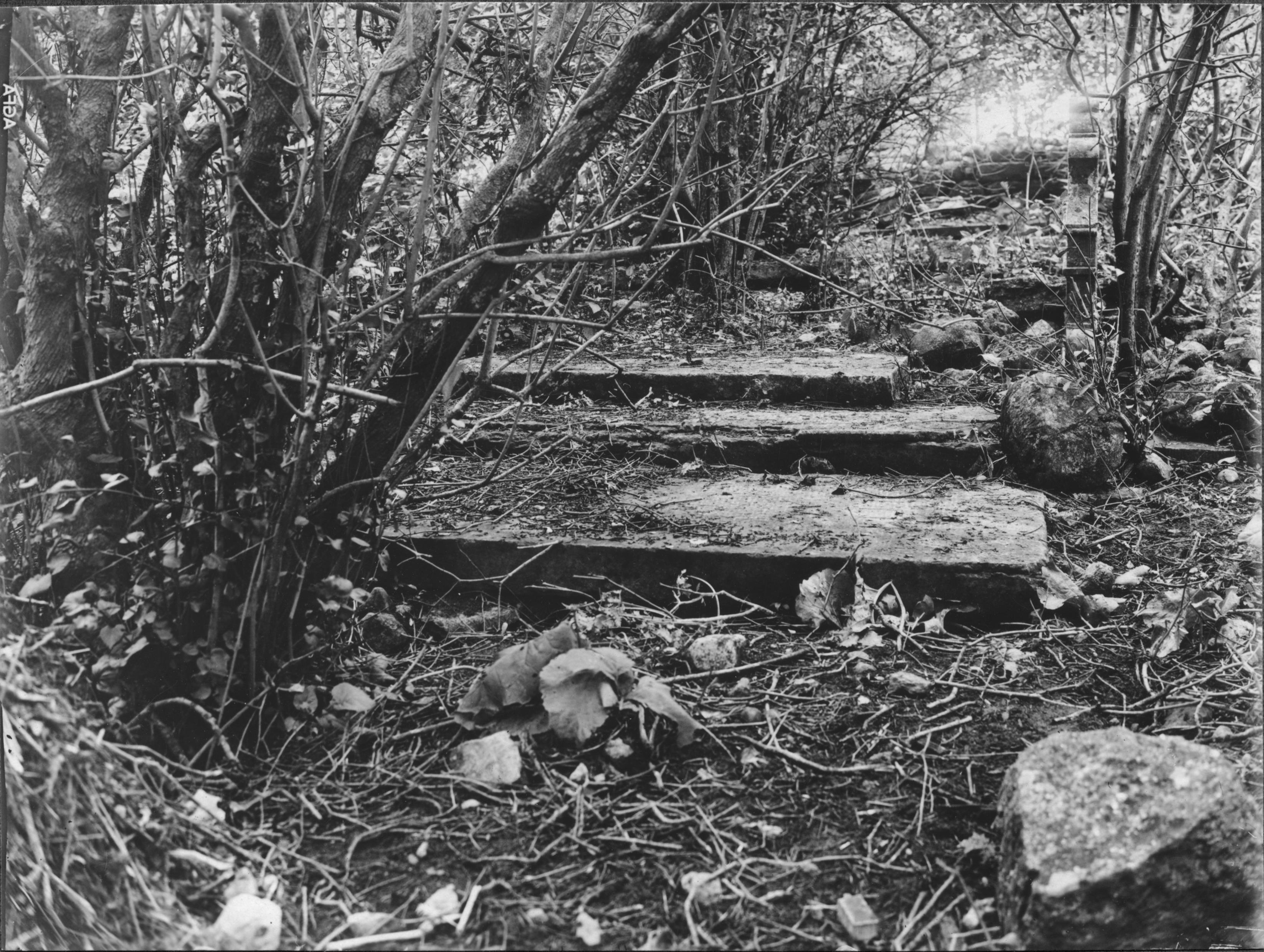 Beskrivning: Ödekyrkogården. Gravhällar staplade på varandra söder om kyrkan