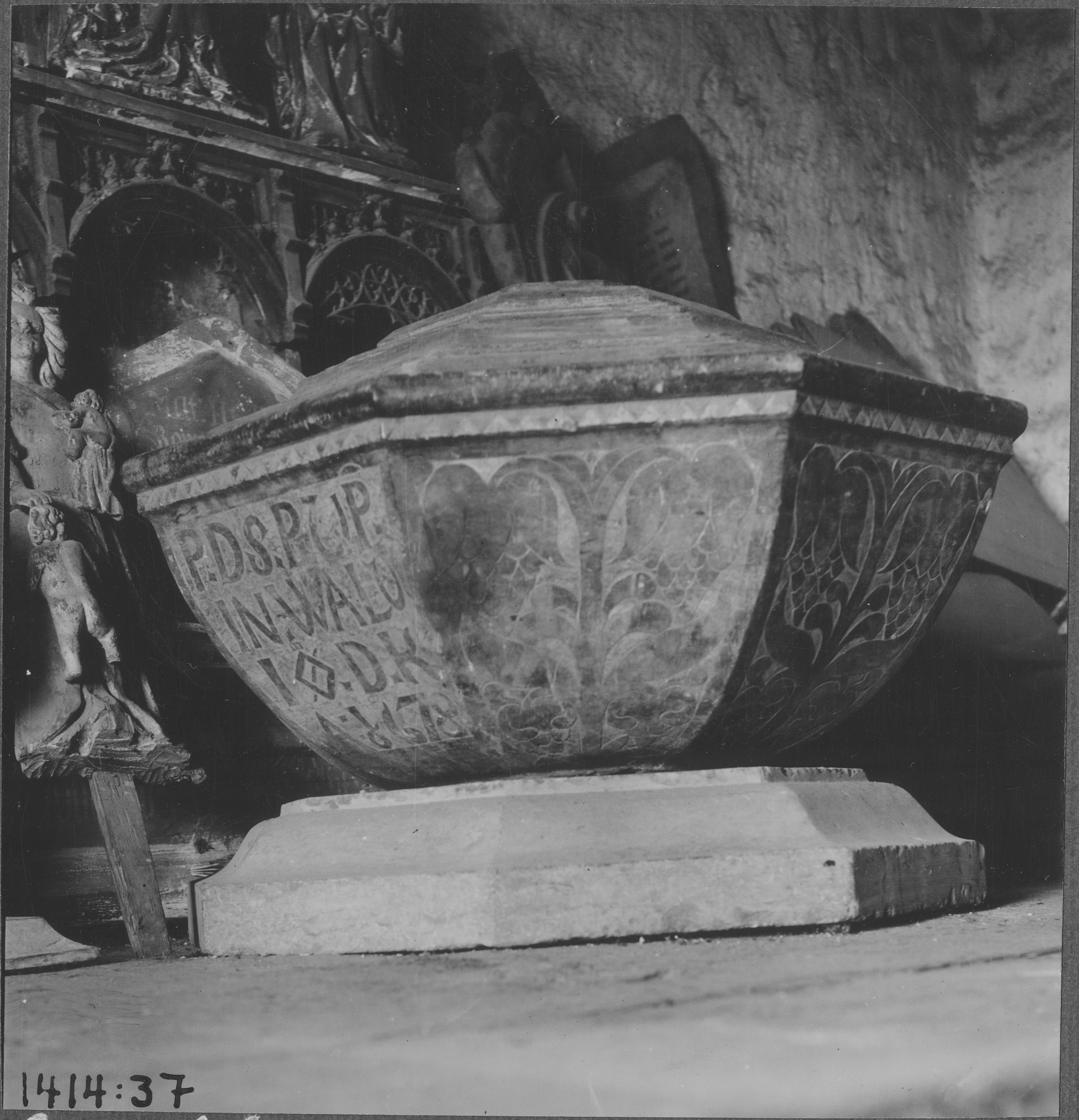 Beskrivning: Dopfunt av täljsten, åttakantig cuppa, kalformad. Ornerad med blommor i låg relief.Inskrift med årtalet 1678. Snabbinventering.