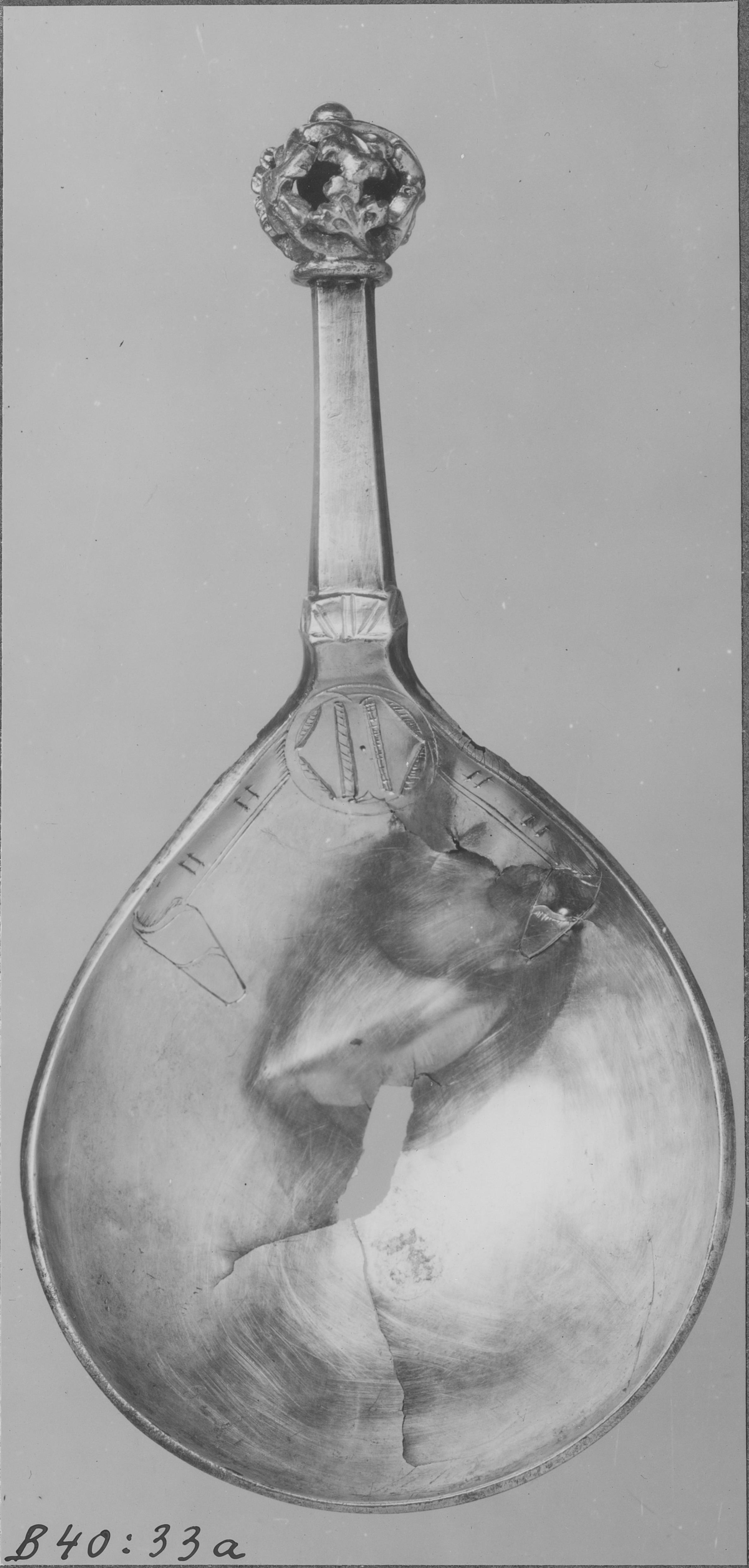 Beskrivning: Senmedeltida sked av silver, delvis förgylld. SHM invnr: 18011:196