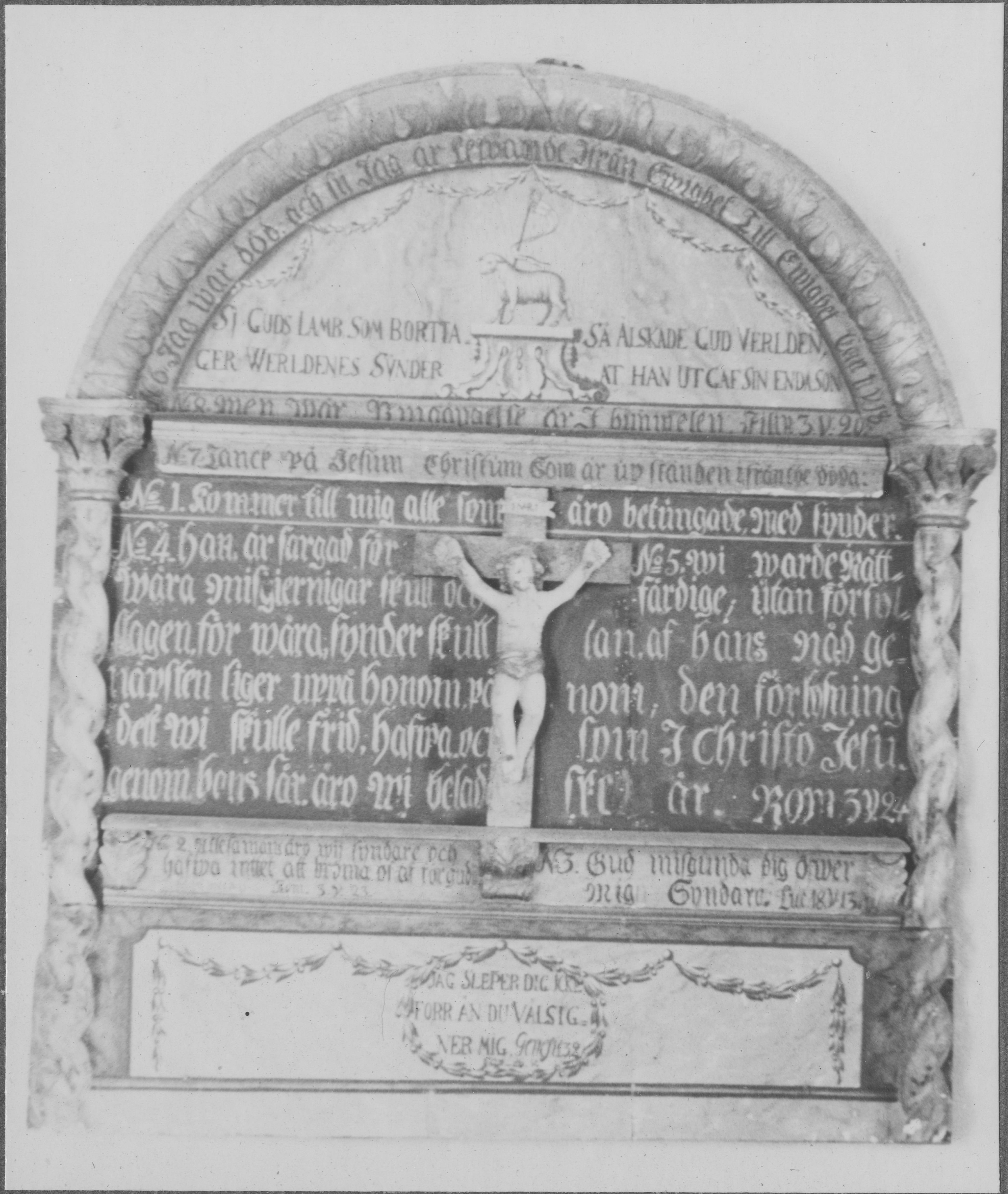 Beskrivning: Tavla av skulpterat och målat trä med bibelspråk, skänkt vid slutet av 1700-talet.