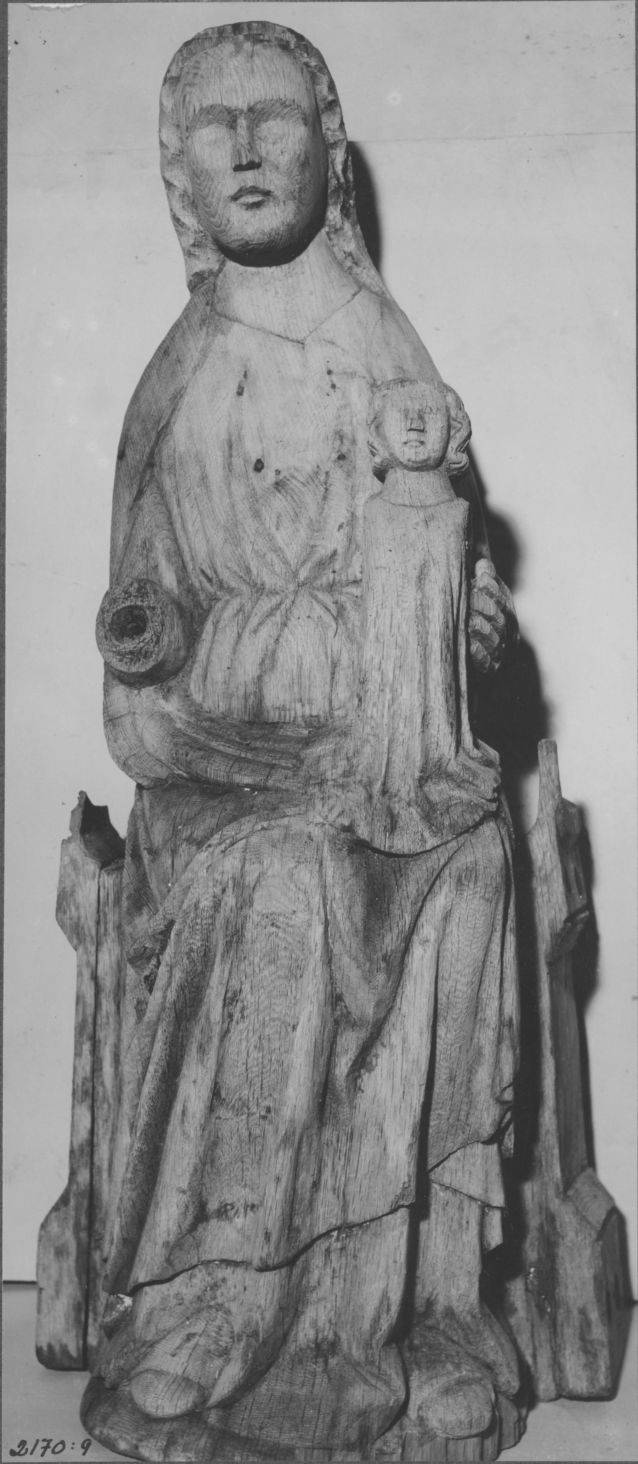 Beskrivning: Träskulptur föreställande Maria sittand på tron med Jesusbarnet stående i knät. 1300-talets början.