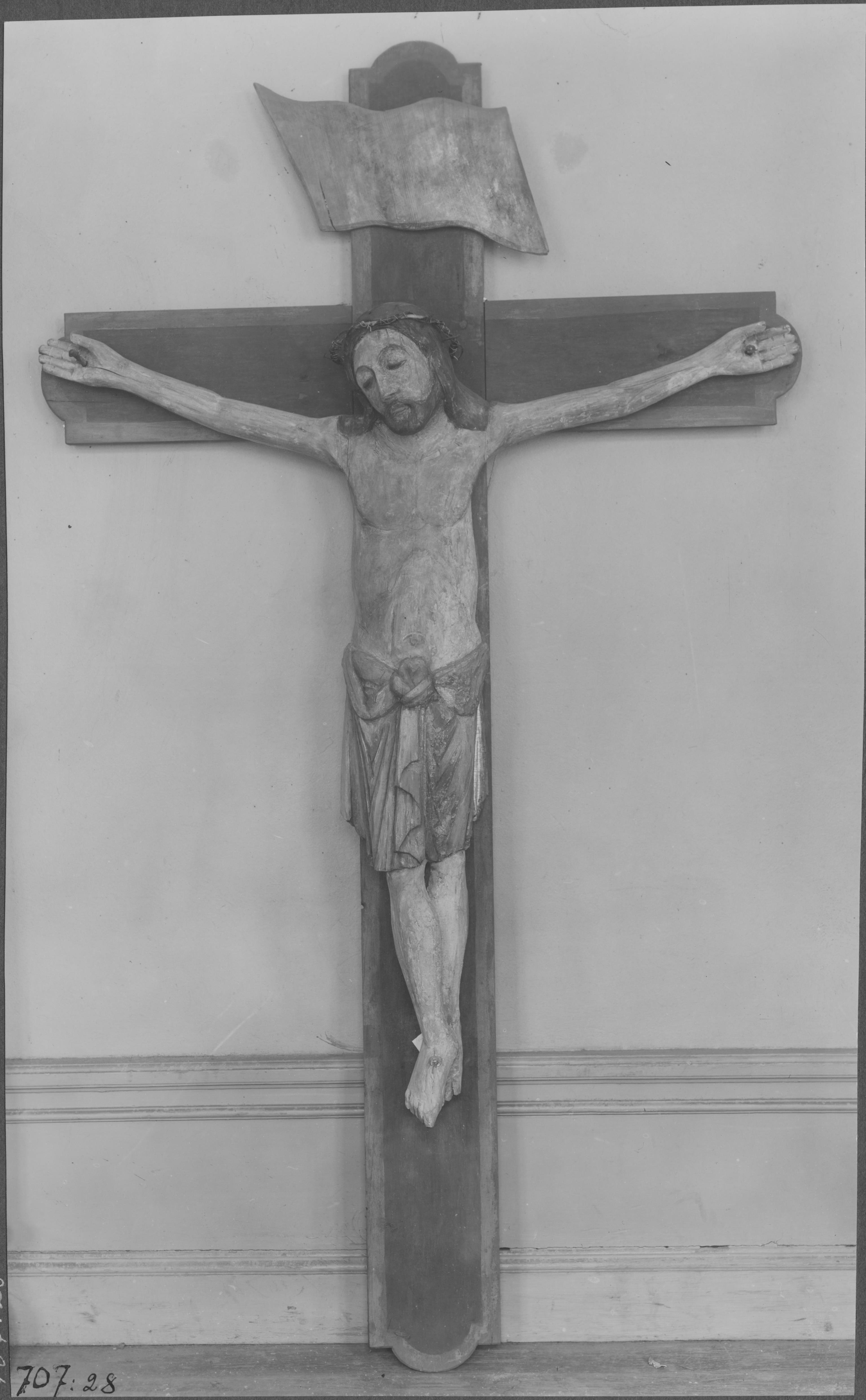 Beskrivning: Triumfkrucifix av trä. Figuren snidad i björk, korset av furu. Rester av färg på drapering och ansikte. Omkring 1200. Efter restaurering av Alfred Nilsson