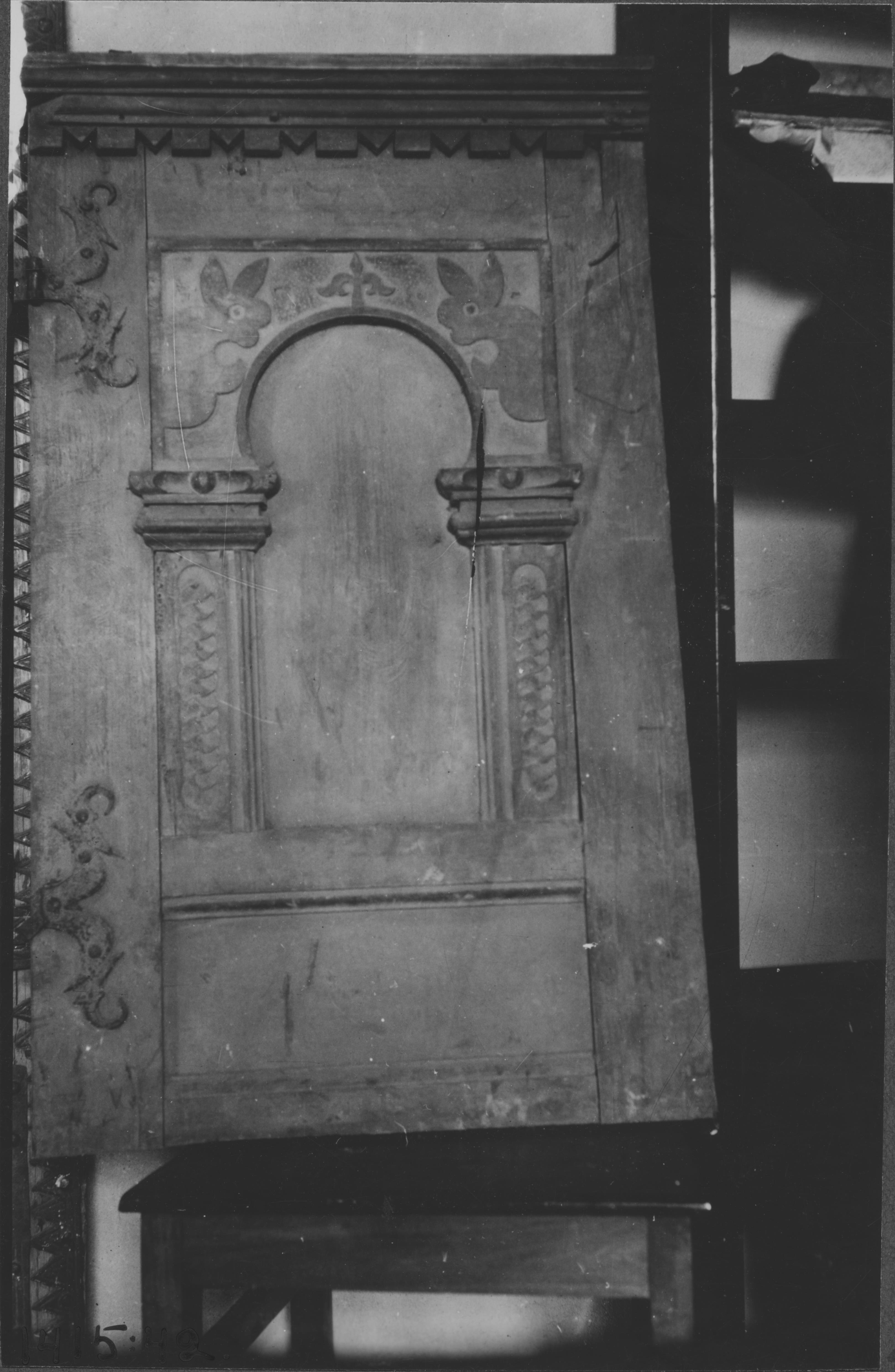 Beskrivning: Bänkdörr. Spegel med hästskobåge och stiliserade ekorrar. Snidade gångjärn.