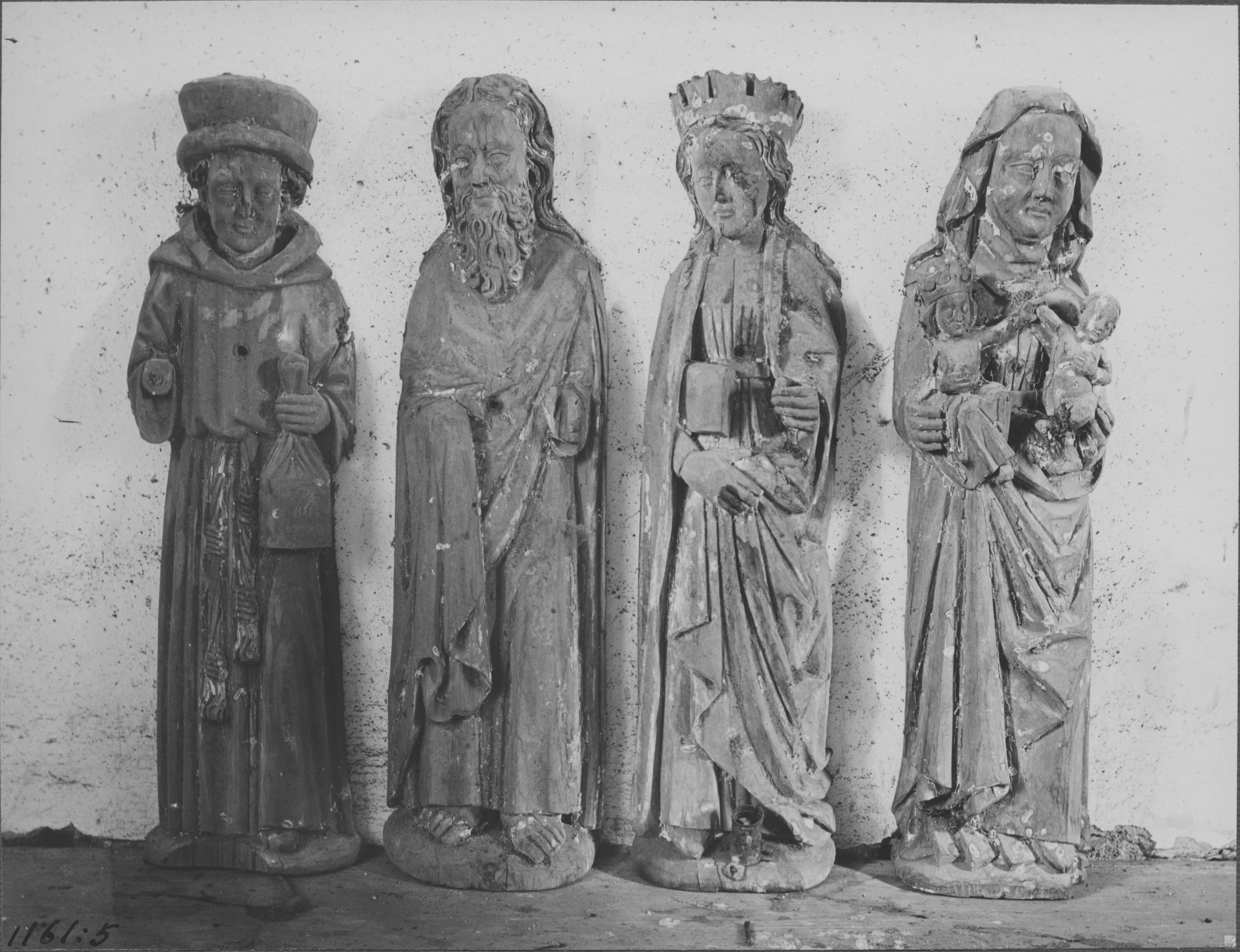 Beskrivning: Träfigurer från ett altarskåp; munk med bokpåse, skäggig apostel, kvinnligt helgon med krona samt Anna själv tredje med Maria och Jesusbarnet.