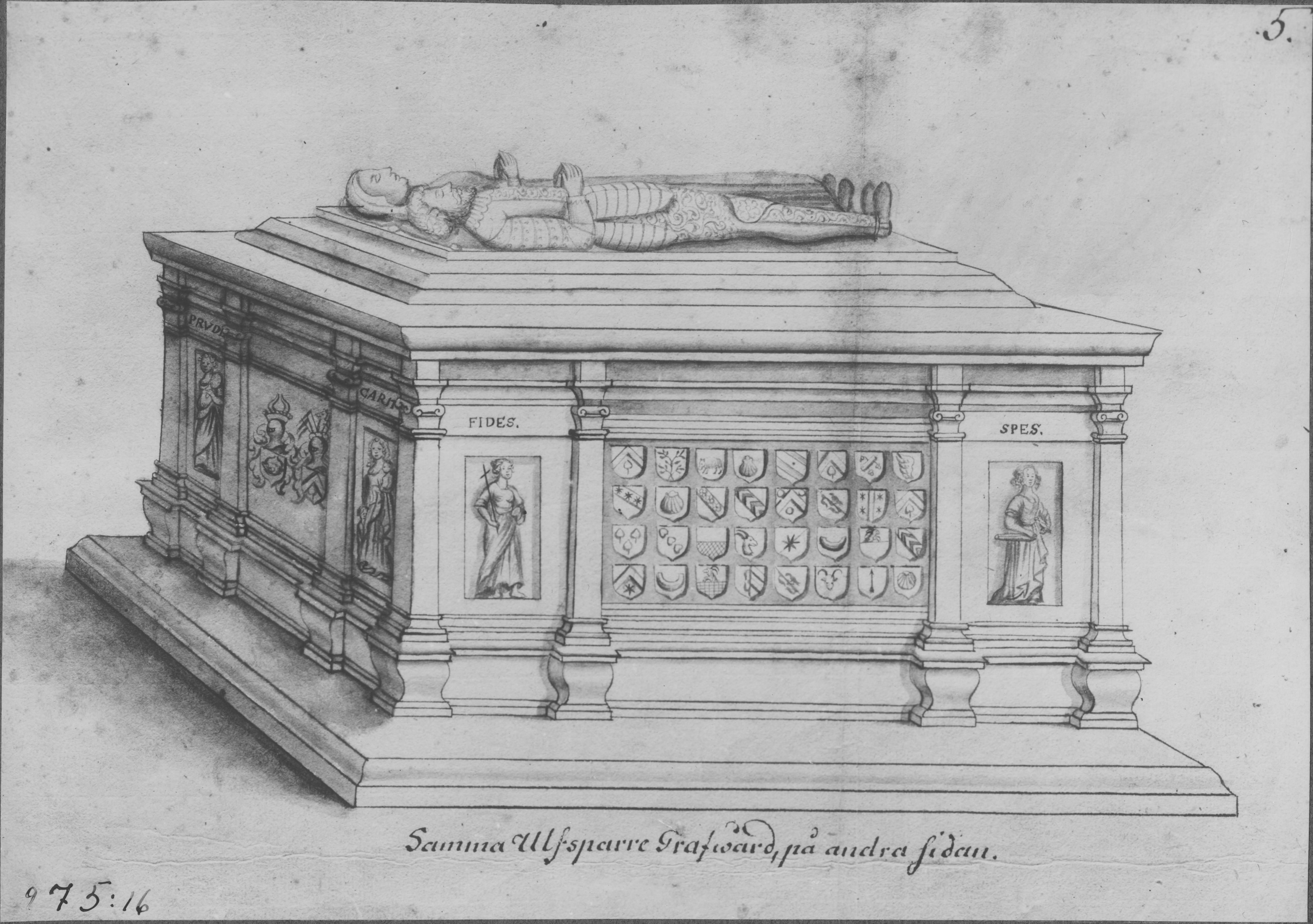 Beskrivning: Gravmonument över Erik Göransson Ulfsparre och hans hustru Beata Oxenstierna. Teckning ur Nescher. "Ritade kyrkor i Wadstena län". Ritning av Elias Brenner 1669-1670.