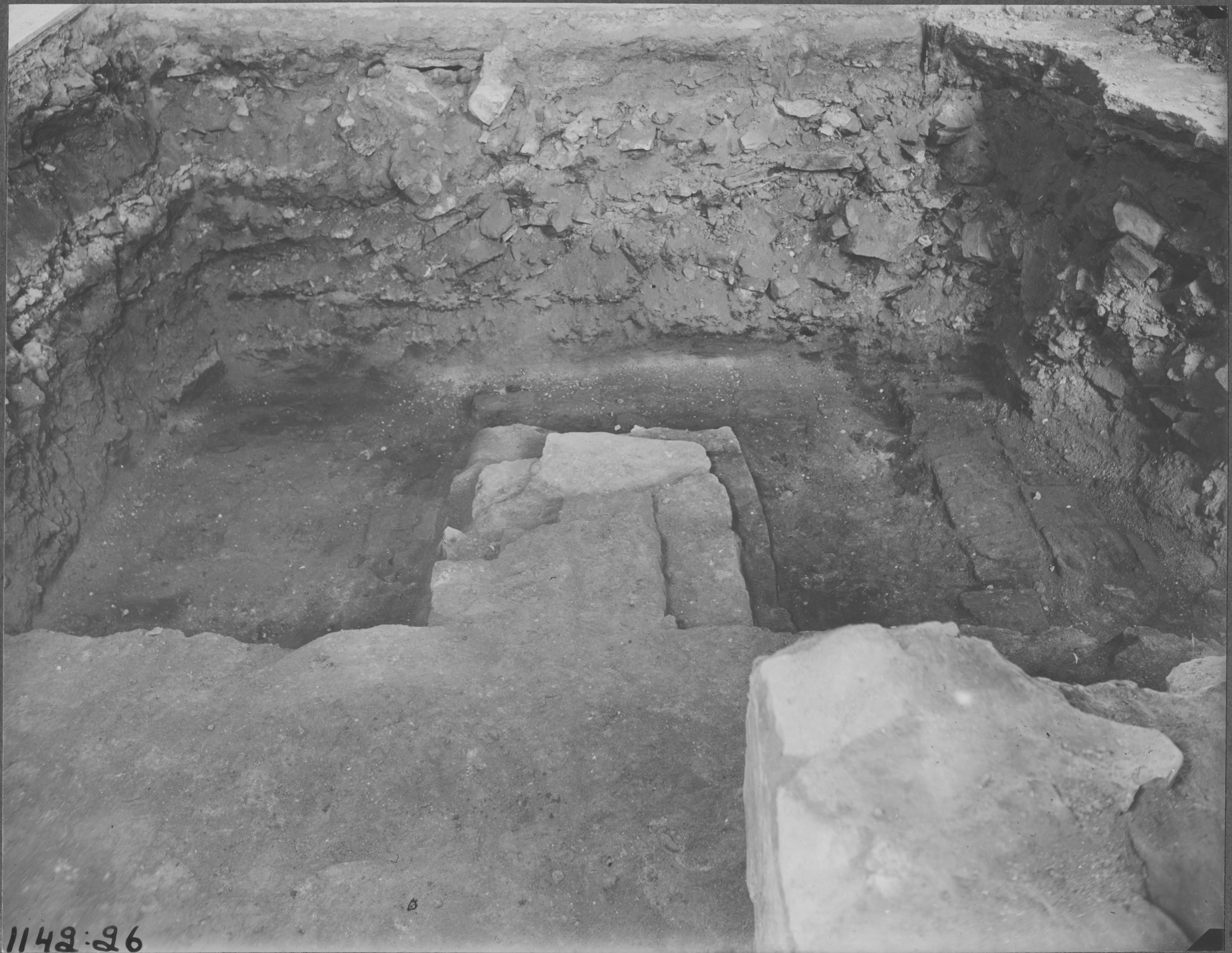 Beskrivning: Hörnet av 1100-talskyrkans långhusgavel och korets norra mur. Rester av hörnpilaster som stött mot den bortbrutna triumfbågsmuren. Från norr.