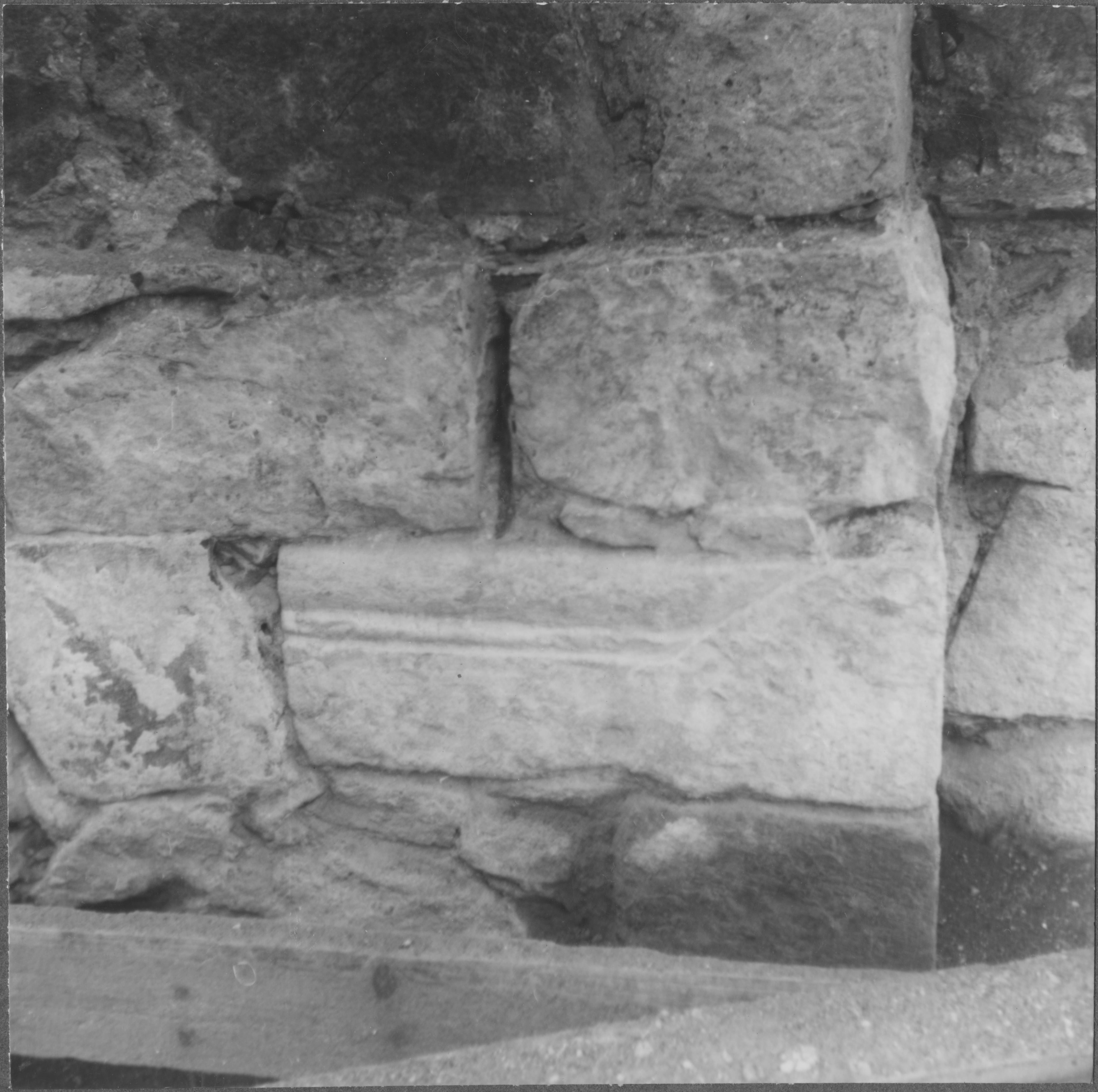 Beskrivning: Sten nummer 1. 72X40X27 cm. Murverksdokumentation i samband med att putsen knackades ner. Profilerade