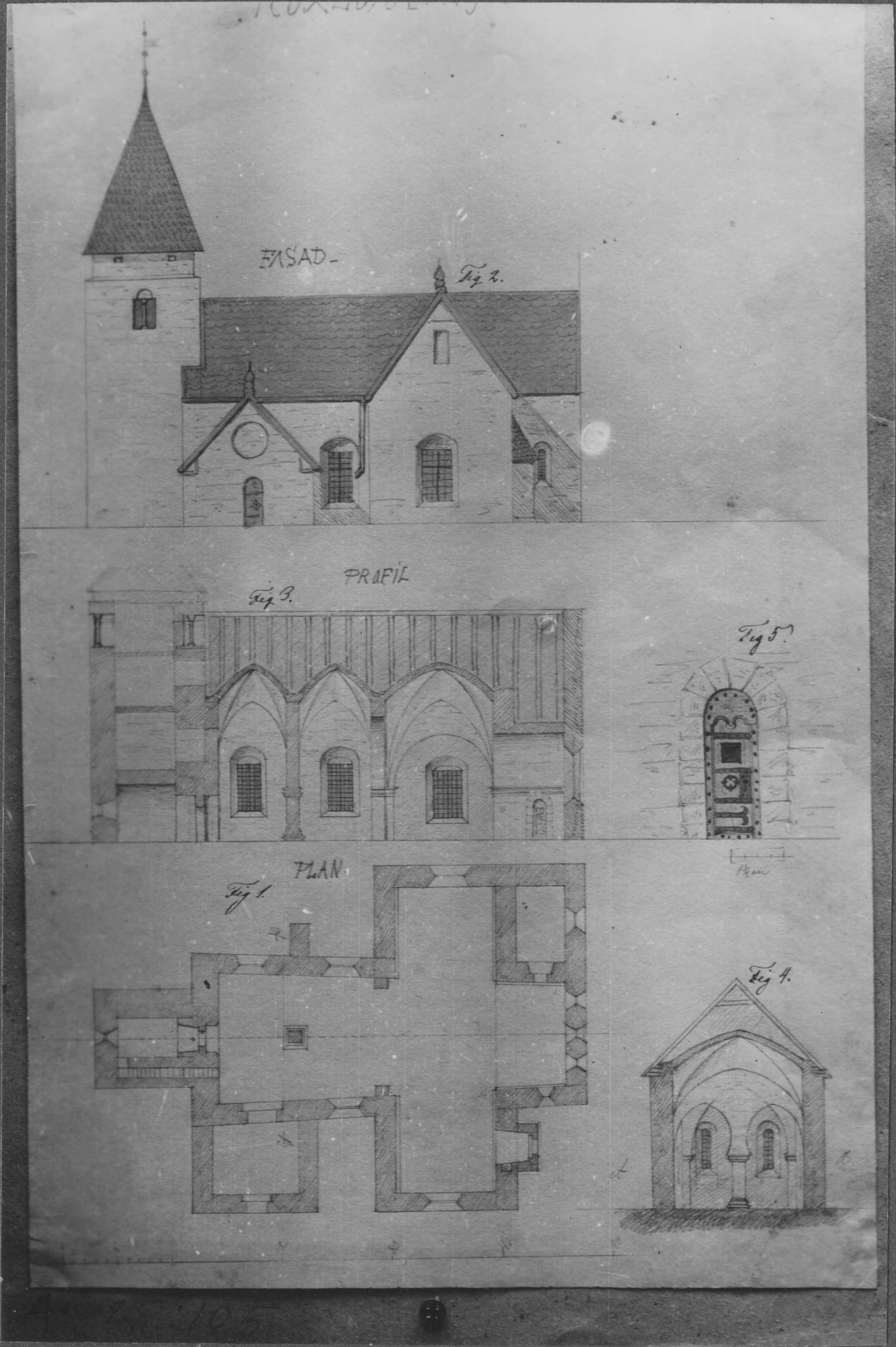 Beskrivning: Kyrkan. Ritningar av fasad, profil och plan. Ur Mandelgrenska samlingen i Lund.