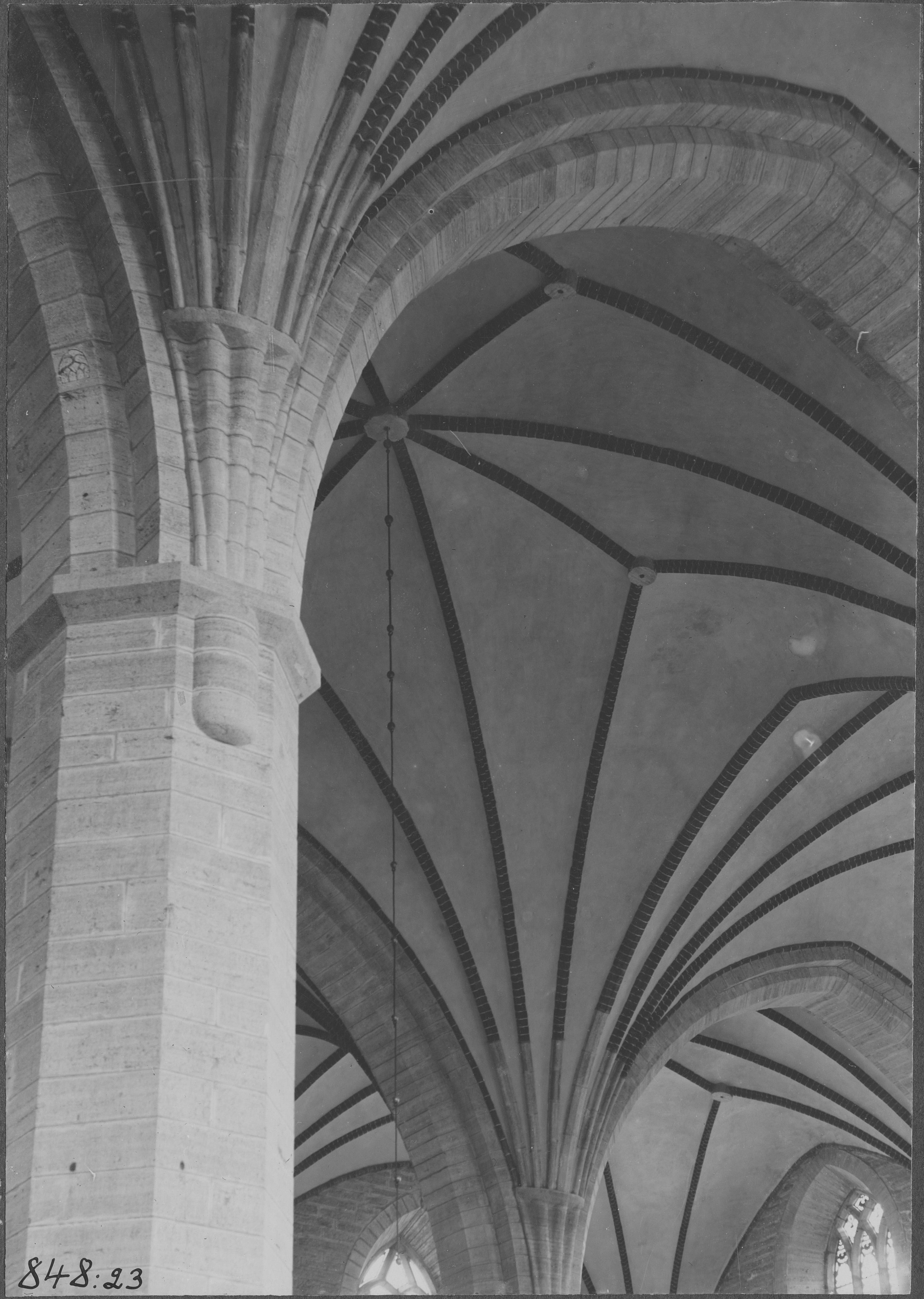 Beskrivning: Valvanfang i andras pelaren från öster i södra raden.