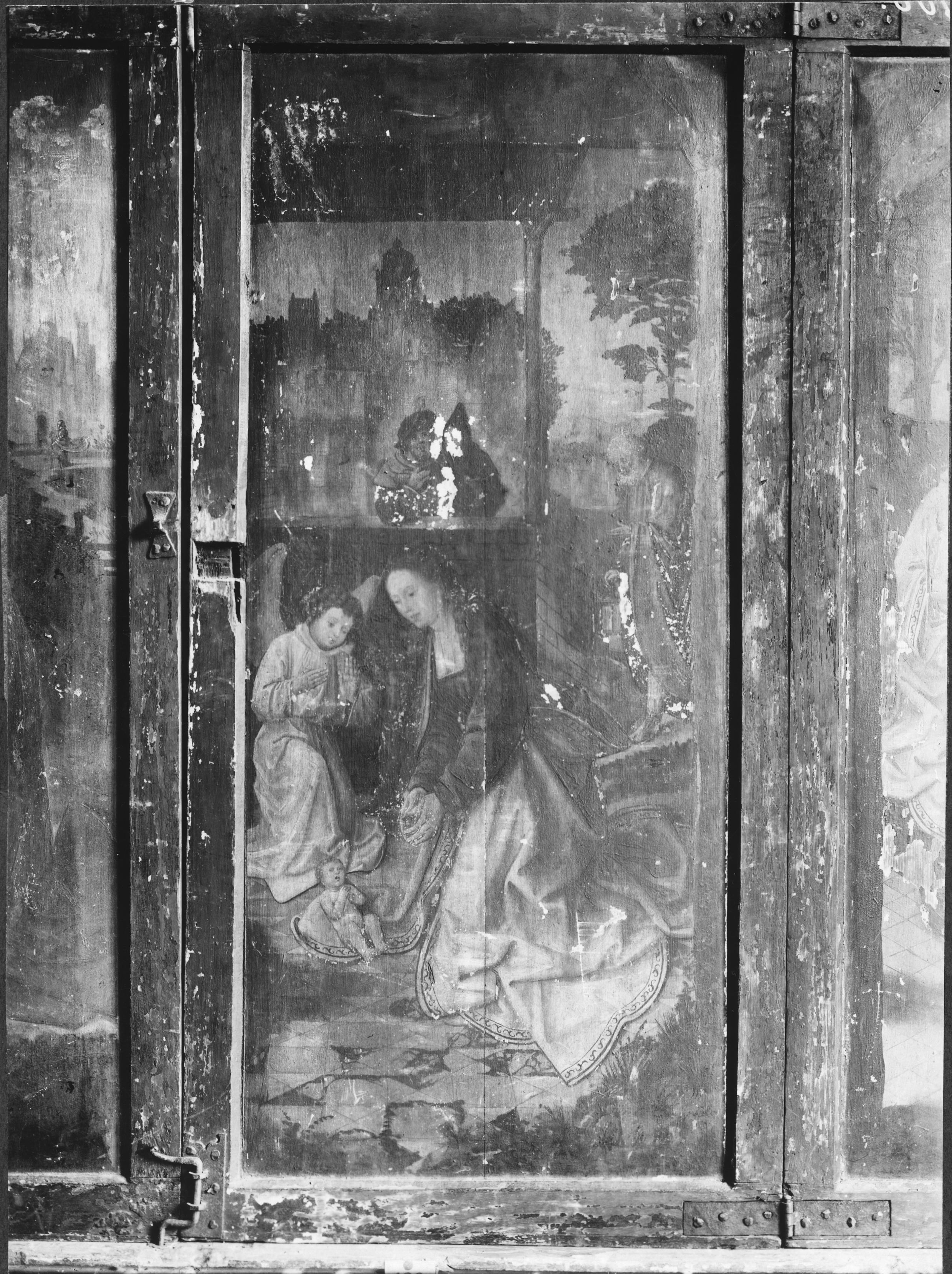 Beskrivning: Altarskåp, nederländskt arbete. 1500-talets början. De målande framställningarna på dörrarna samt de skulpturala i korpus bilda en sammanhängande berättelse ur Kristi liv. Detalj av målad dörr.