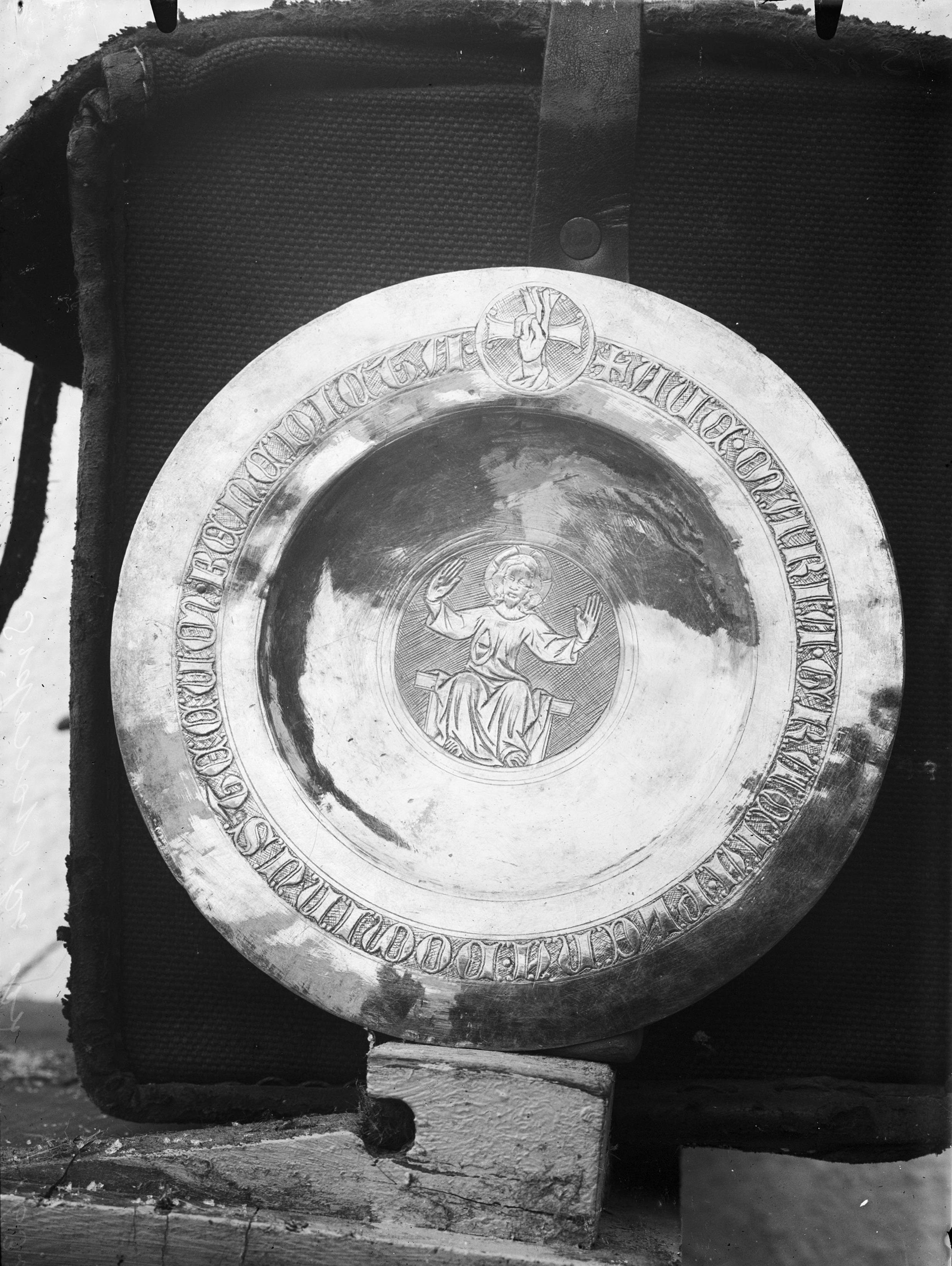 Beskrivning: Patén av silver, förgylld. I fördjupningen graverad bild av Kristus, sittande på en tron inom ring. På bredden en hand med två uppsträckta fingrar mot korsgloria. Inskrift på baksidan: "Sidensjö Kyrka 1860". Diam. 14,6 cm. 1300-talet. Snabbinv.