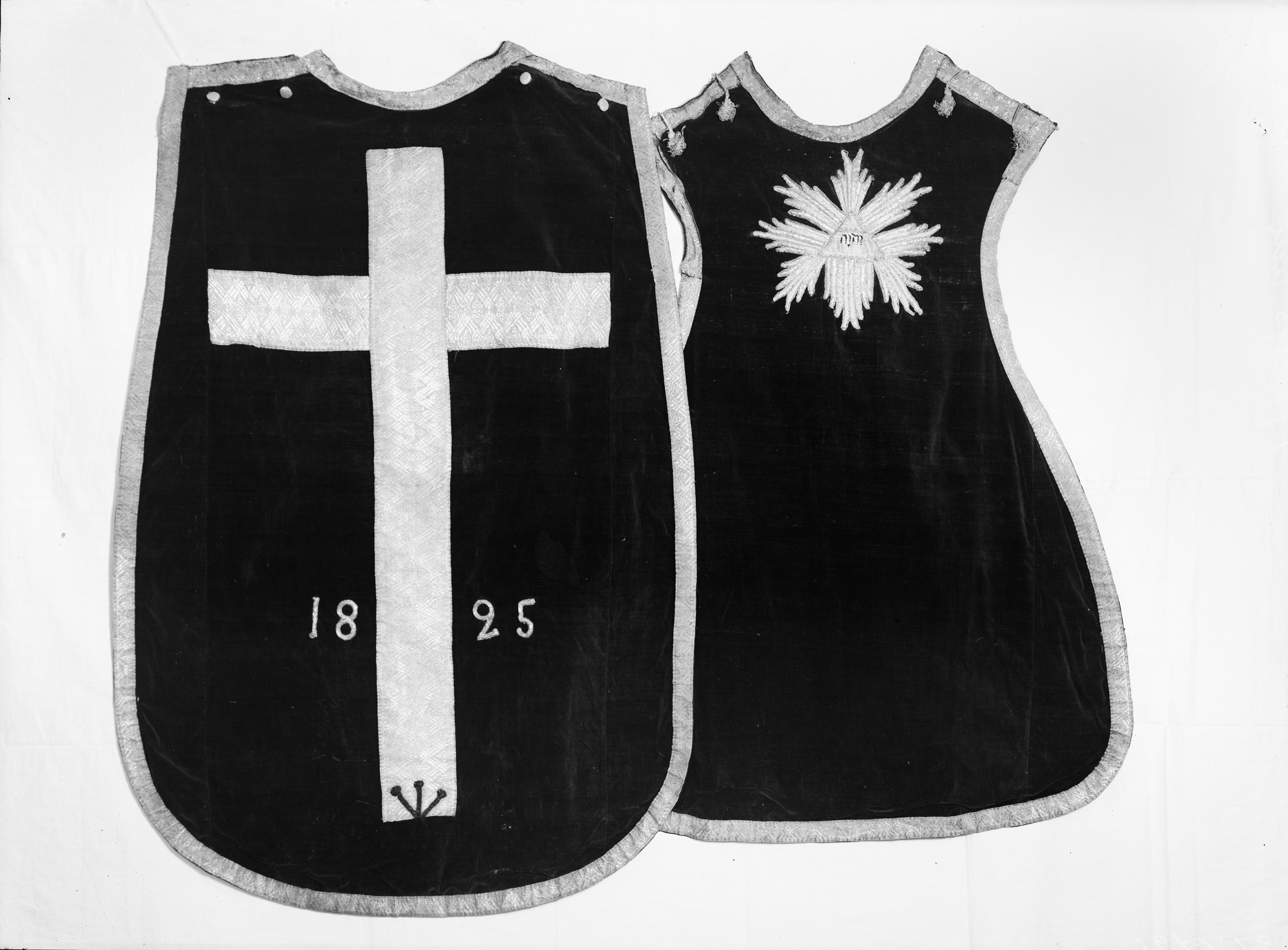 Beskrivning: Mässhake, av svart sammet. På bröststycket "Jehova" i sol. På ryggstycket kors av breda band i silverfärg och "1825", snabbinv. Före renovering. Diakonissanstalten.