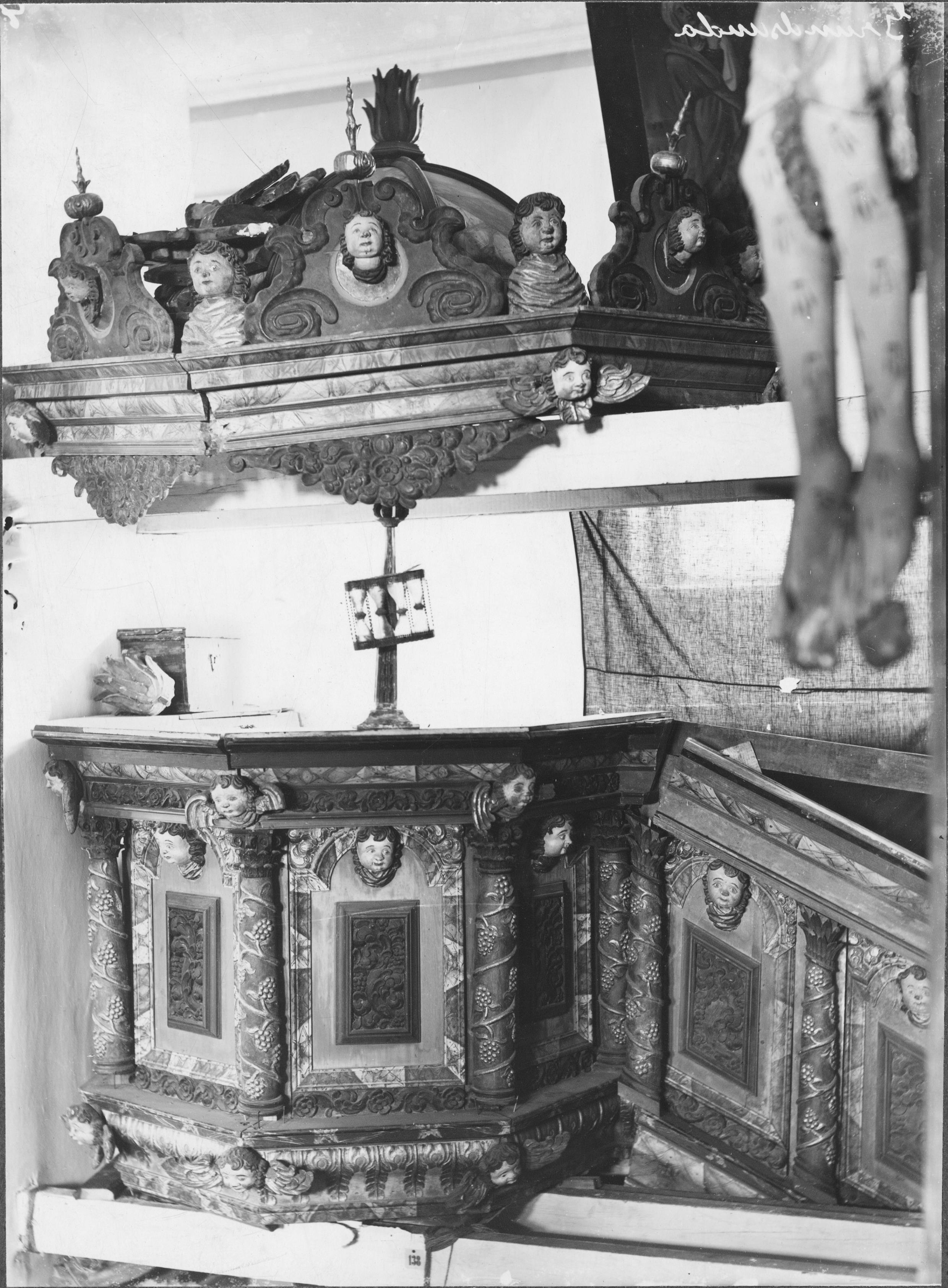Beskrivning: Predikstol. Femsidig, i hörnen kolonetter med vindruvsranka. Nischerna innehåller bladornament och har änglahuvuden upptill. 1600-talet, snabbinv.
