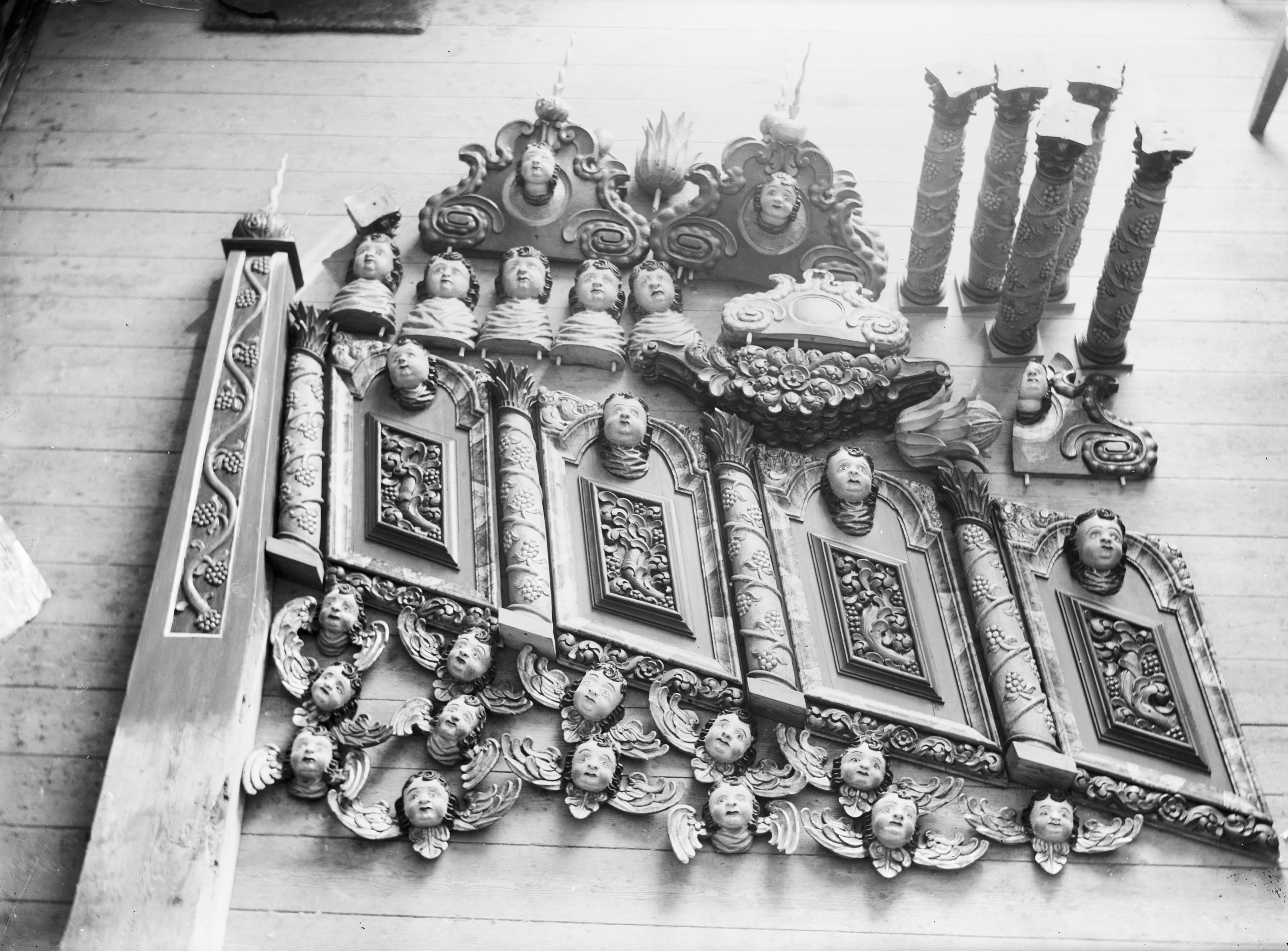 Beskrivning: Delar till predikstol. Femsidig, i hörnen kolonetter med vindruvsranka. Nischerna innehåller bladornament och har änglahuvuden upptill. 1600-talet, snabbinv. Före restaurering.
