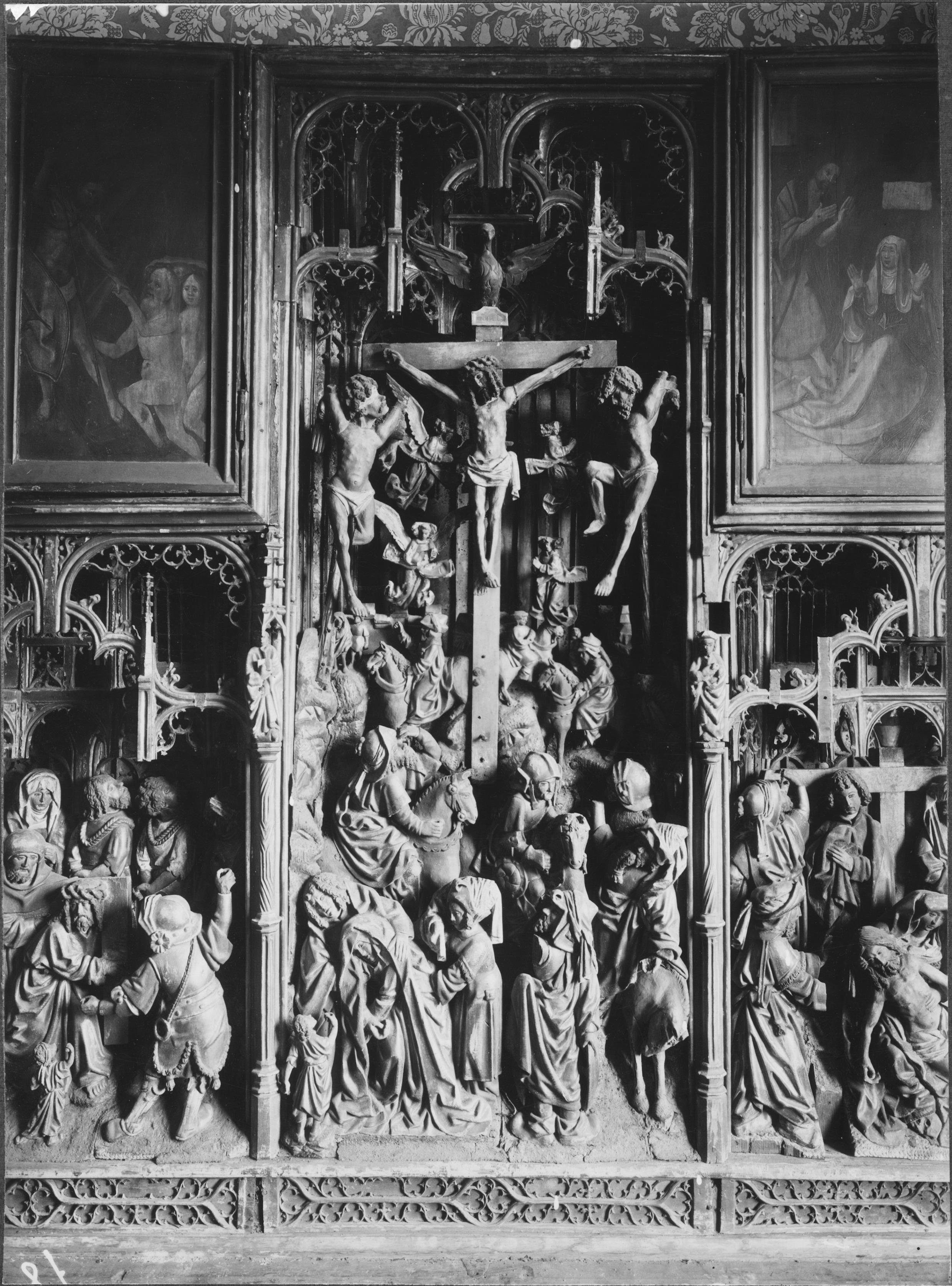 Beskrivning: Altarskåp, nederländskt arbete. 1500-talets början. De målande framställningarna på dörrarna samt de skulpturala i korpus bilda en sammanhängande berättelse ur Kristi liv. I korpus, mittscenen korsfästelsen.