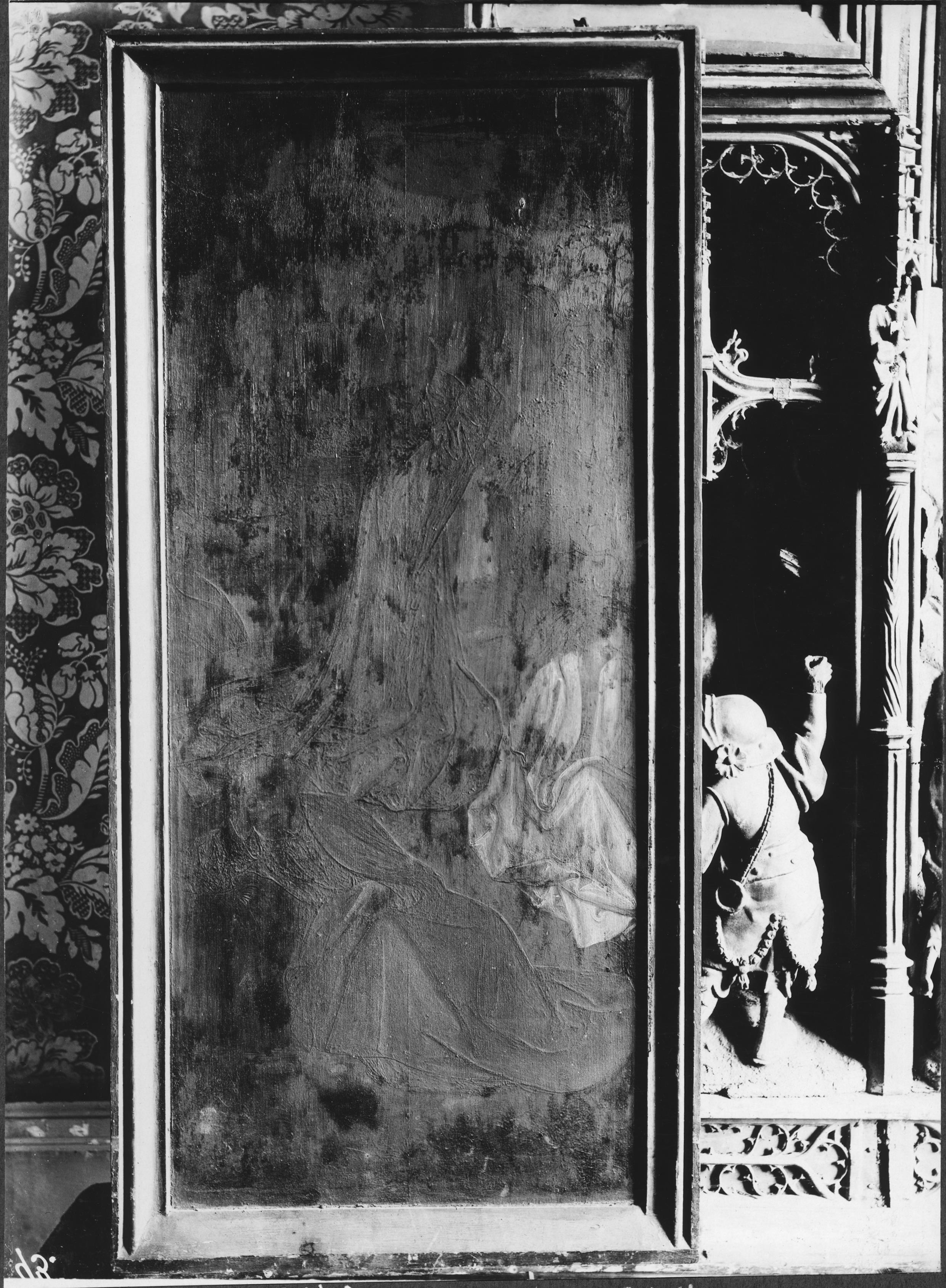 Beskrivning: Altarskåp, nederländskt arbete. 1500-talets början. De målande framställningarna på dörrarna samt de skulpturala i korpus bilda en sammanhängande berättelse ur Kristi liv. Detalj av målad dörr.