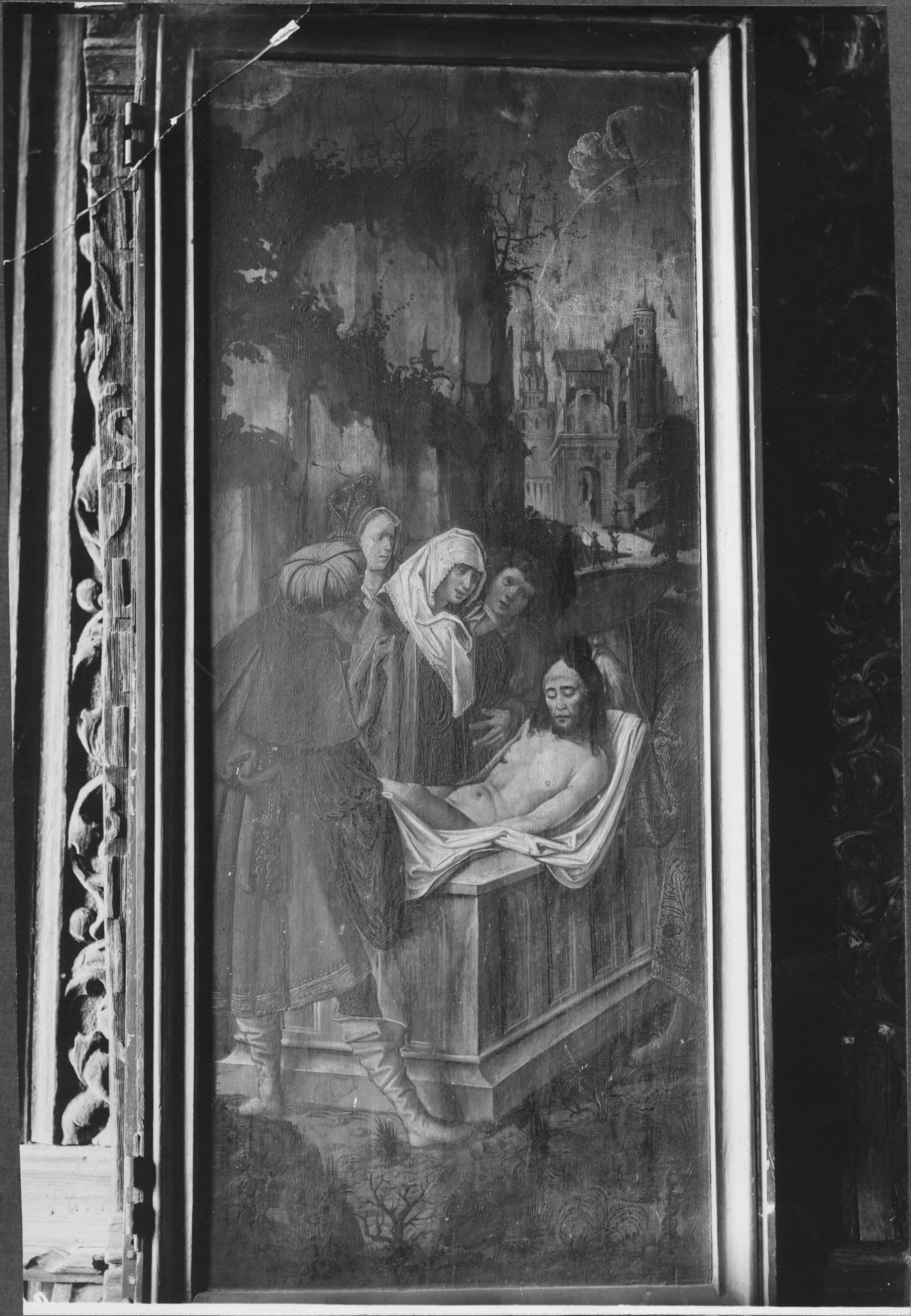Beskrivning: Beskrivning: Altarskåp, nederländskt arbete. 1500-talets början. De målande framställningarna på dörrarna samt de skulpturala i korpus bilda en sammanhängande berättelse ur Kristi liv. Detalj av målad dörr.
