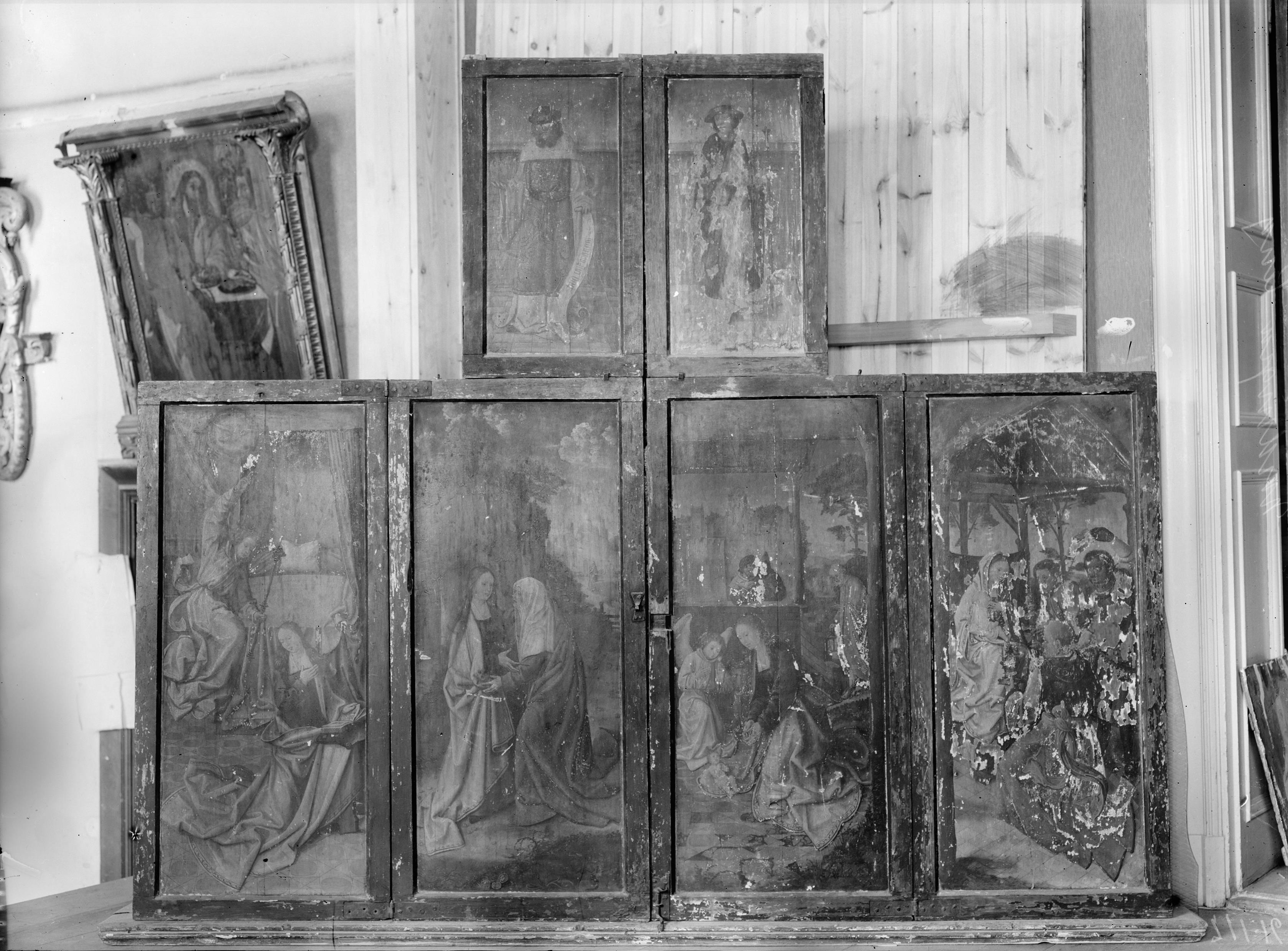 Beskrivning: Altarskåp, nederländskt arbete. 1500-talets början. De målande framställningarna på dörrarna samt de skulpturala i korpus bilda en sammanhängande berättelse ur Kristi liv. Dörrarnas yttersidor, före restaurering.