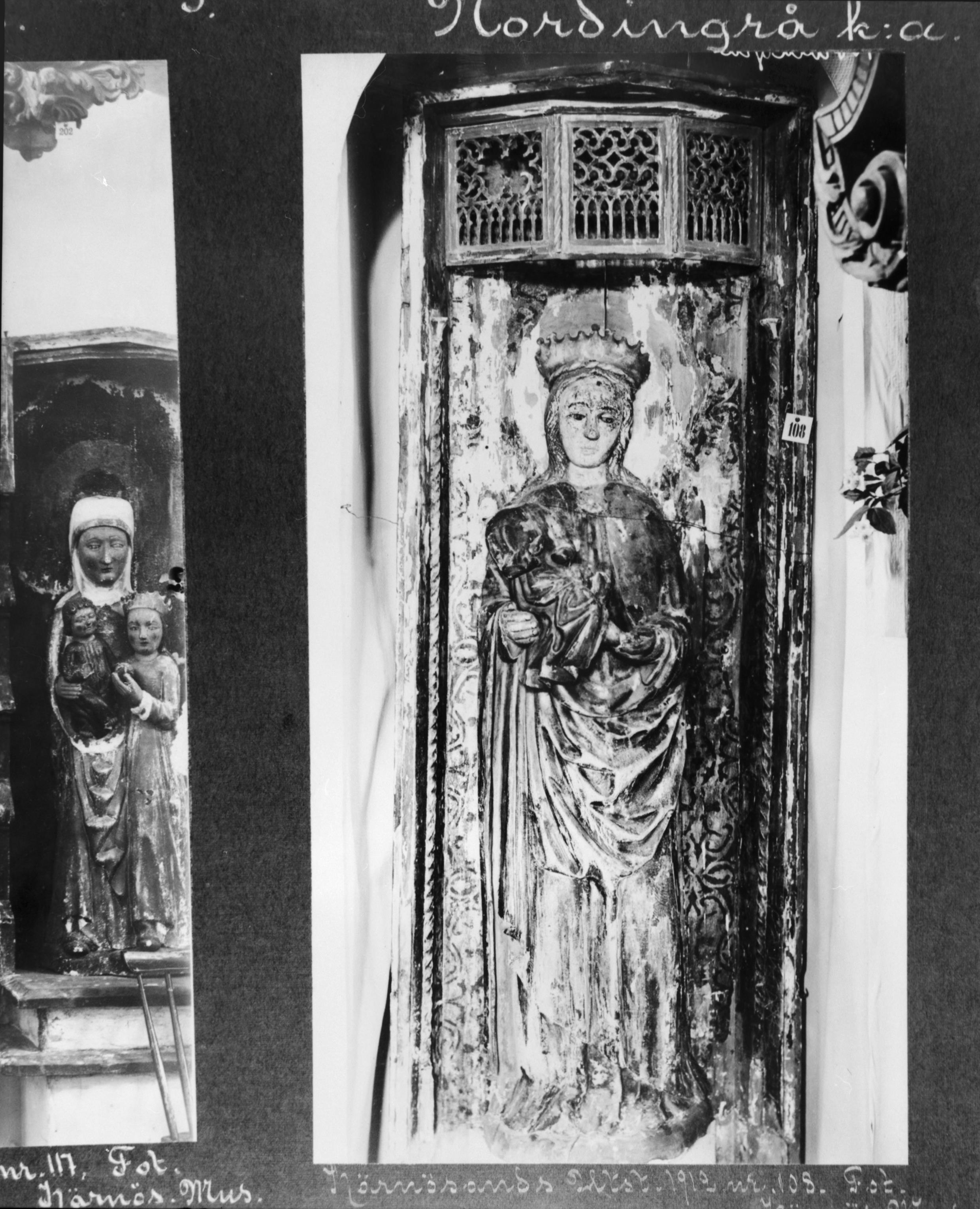 Beskrivning: Träskulptur föreställande Madonnan med barnet. Helgonskåp. Omkring 1500.