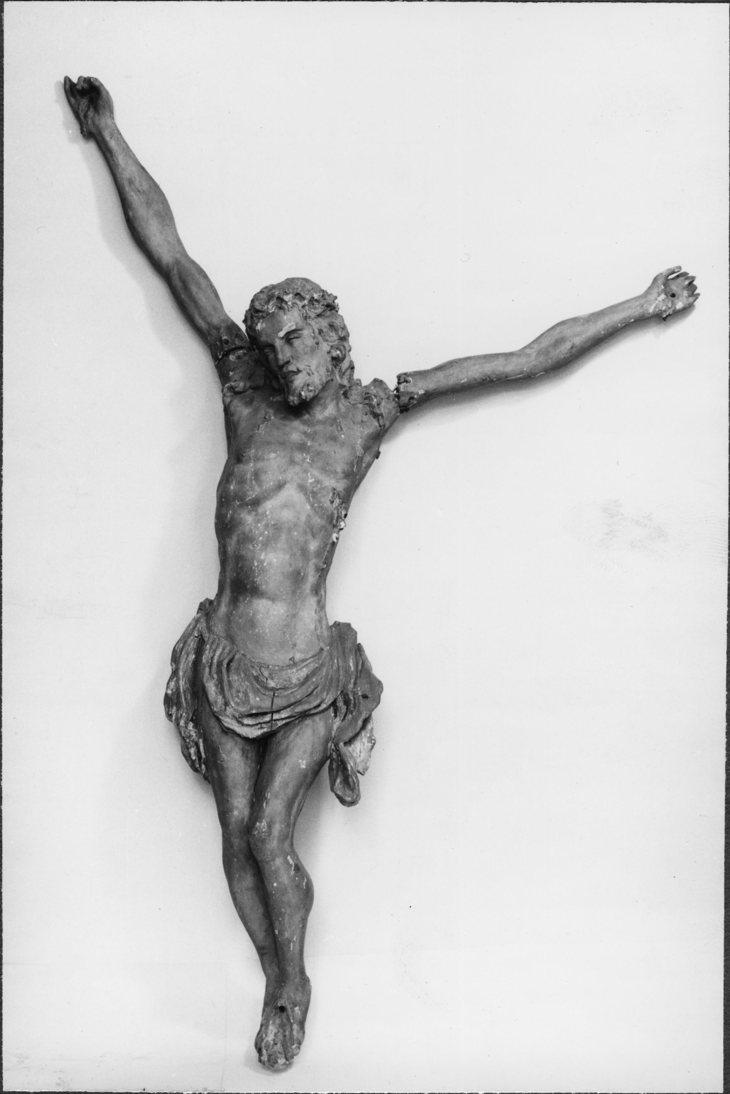 Beskrivning: Kristusbild till krucifix, lövträ. Medeltida.