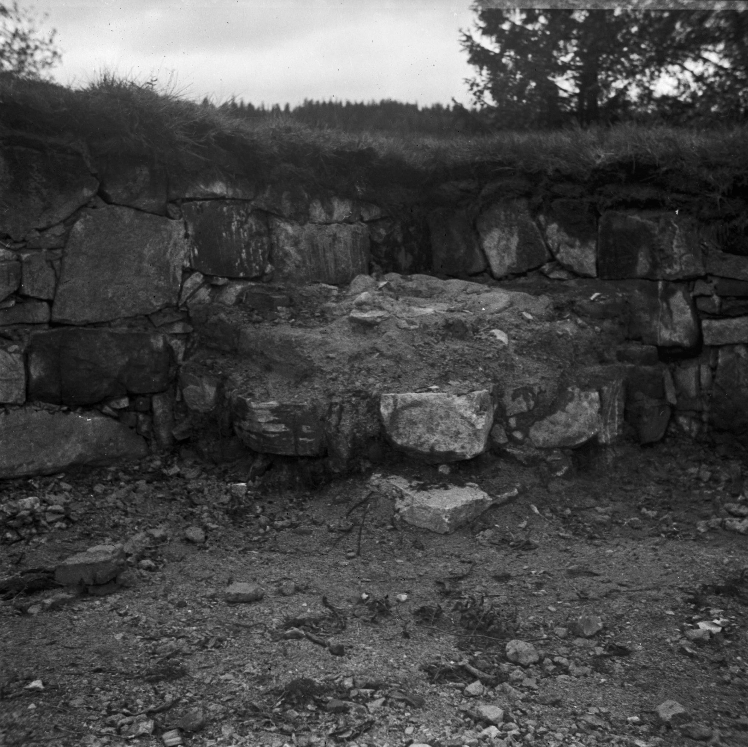 Beskrivning: Kyrkoruinen. Rest av valvpelare i långhustes sydvästa hörn.