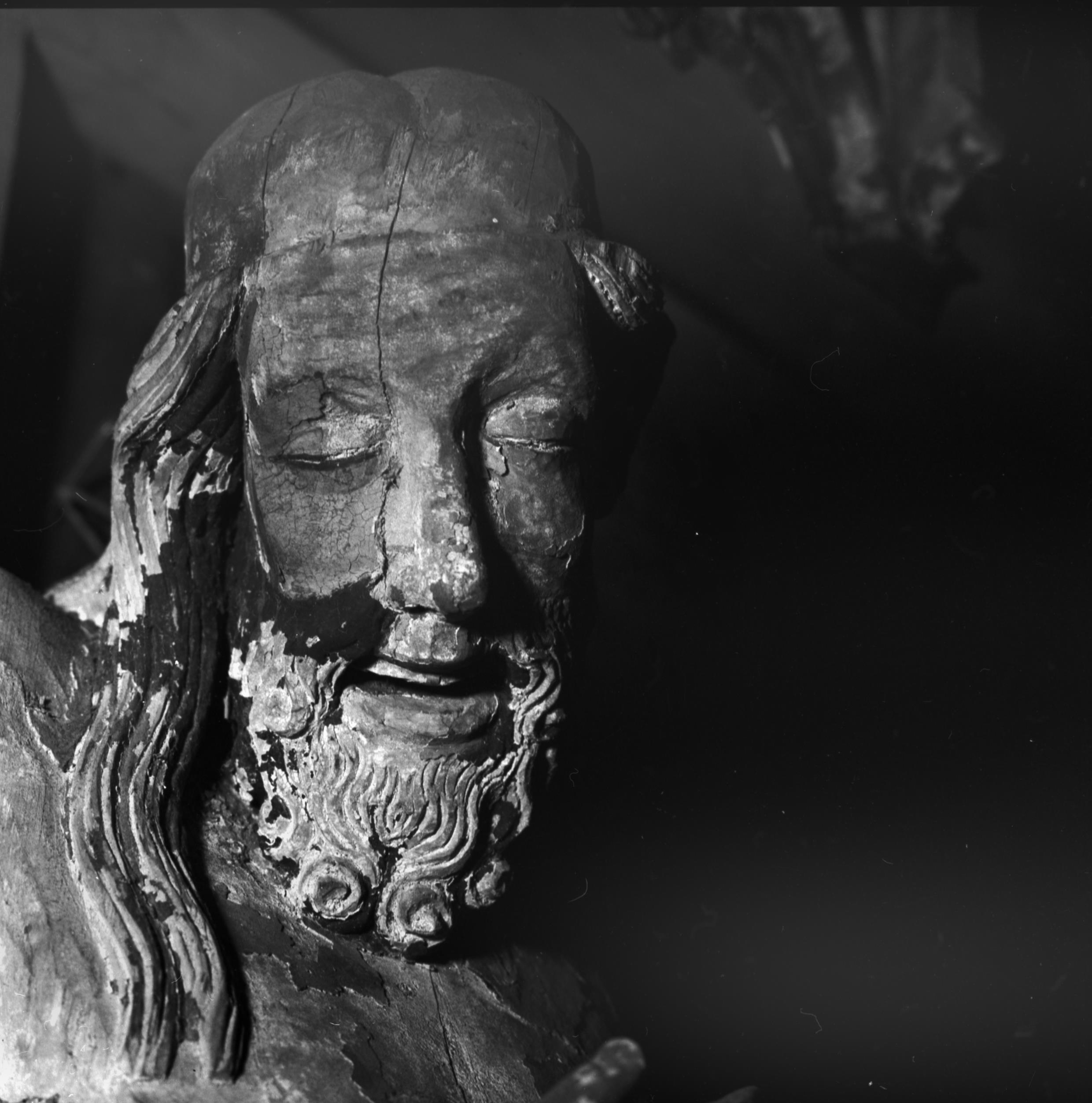 Beskrivning: Altarskåp med två dörrar. I skåpet snidade bilder föreställande en nedtagningsgrupp med en korsfäste, Maria, Johannes och Josef av Arimatia (en figur saknas). Omkring 1500. Detalj.