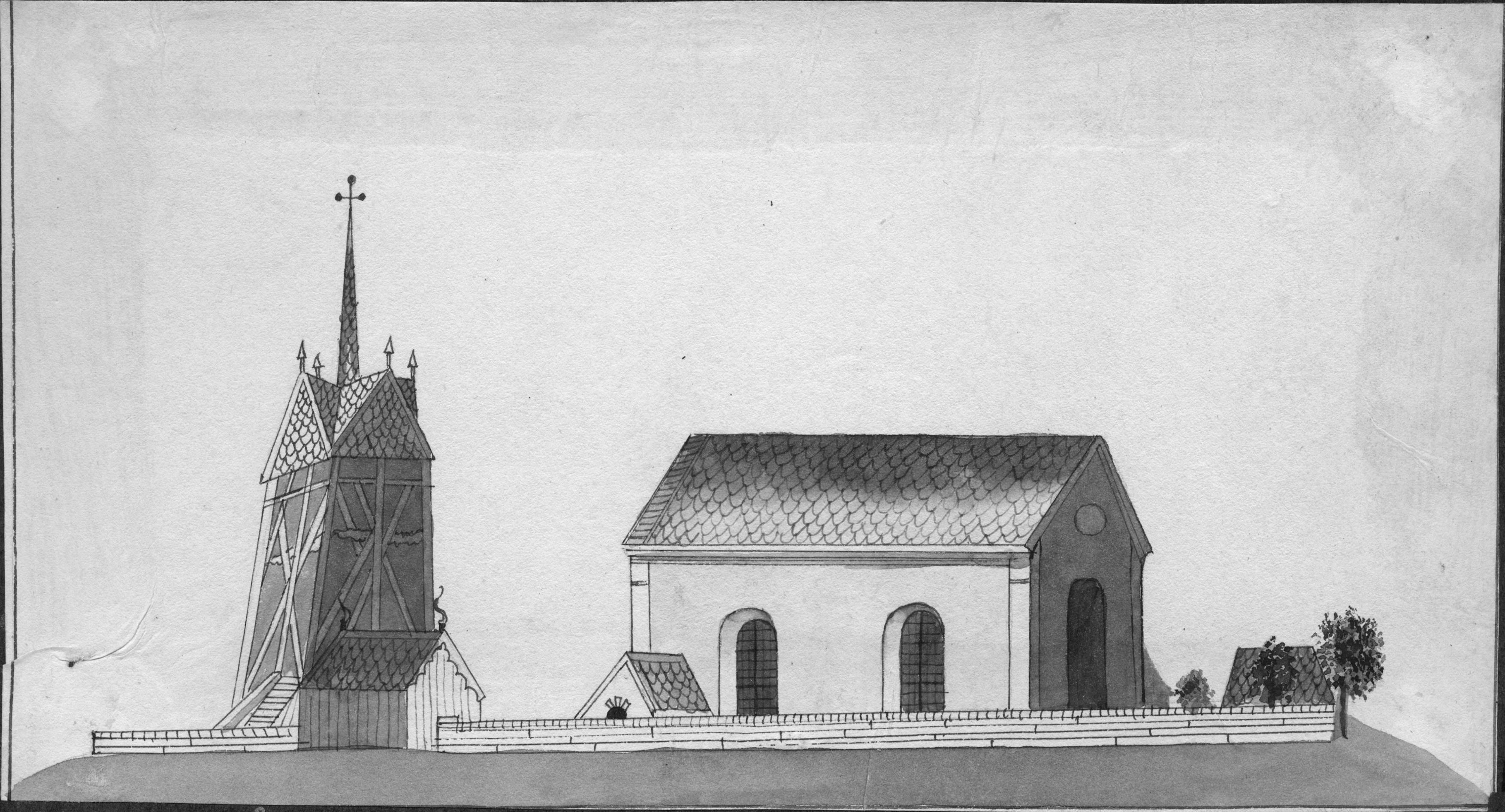 Beskrivning: Kyrkan och klockstapeln. Teckning ur Ohlson: "Ångermanlands kyrkor ritade 1828". Ekdahls samling.