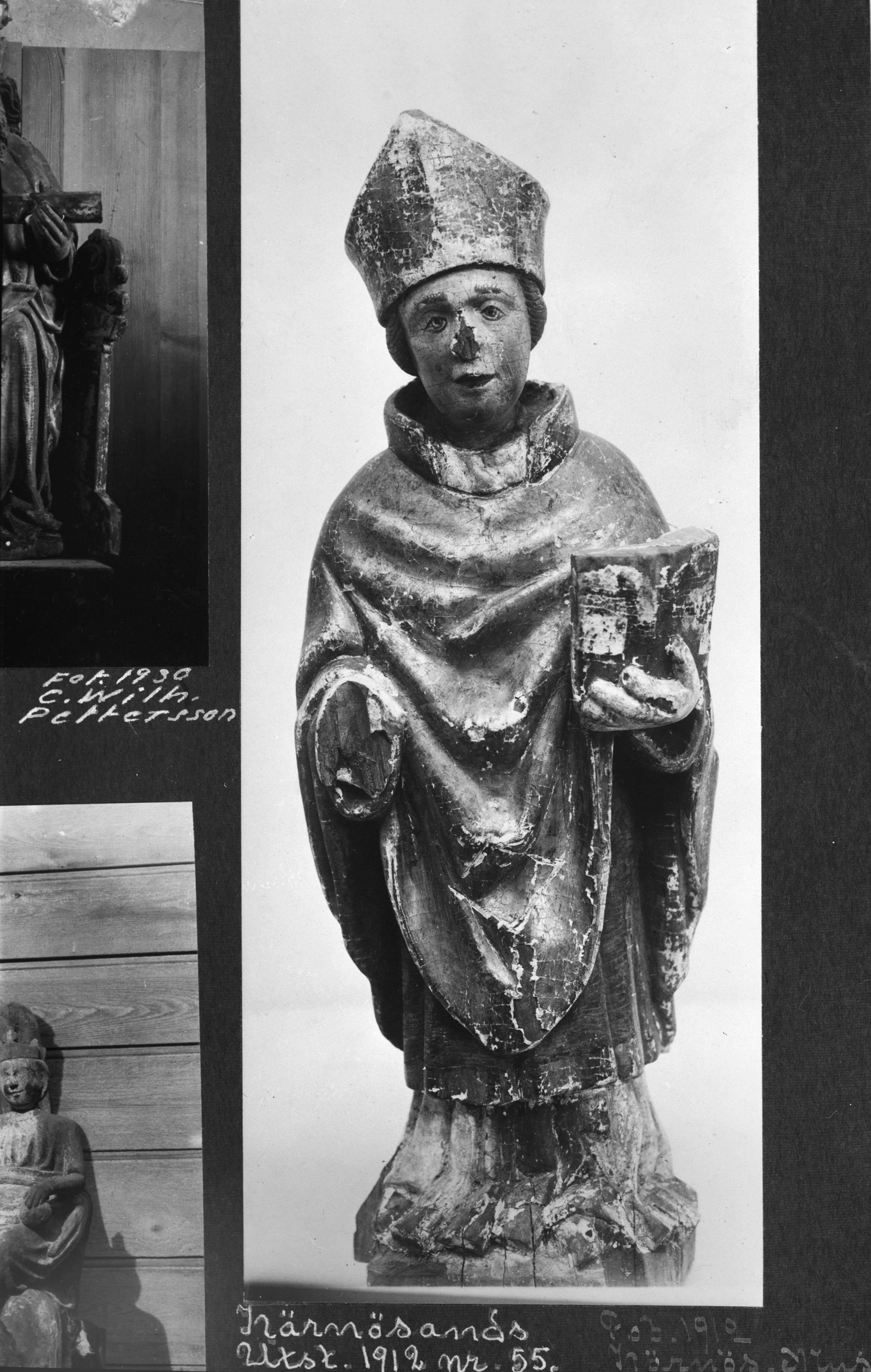 Beskrivning: Träskulptur föreställande en biskop. Från ett altarskåp. 1400-tal.