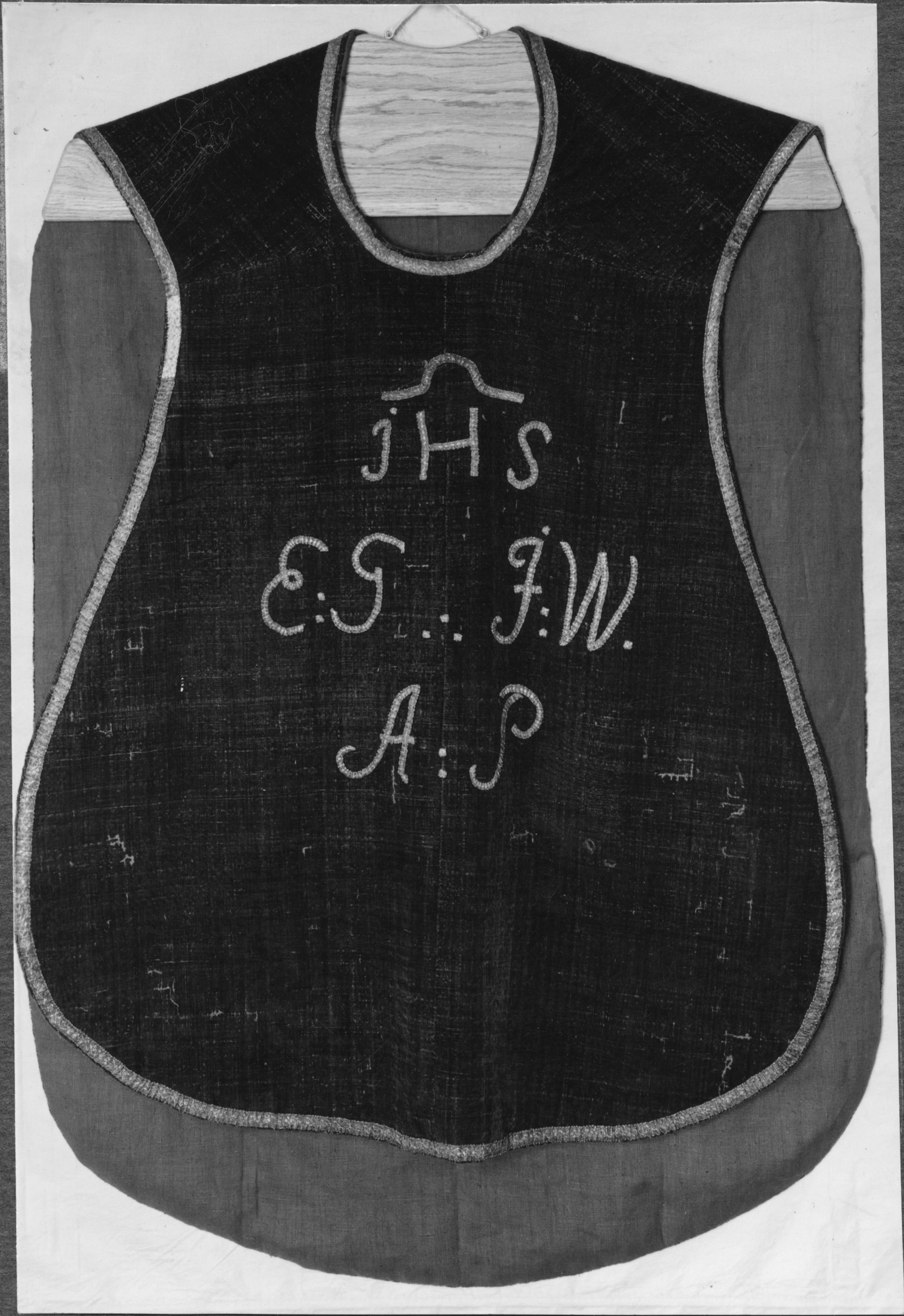 Beskrivning: Mässhake i röd schagg. 1716. Framsida. Efter konservering.