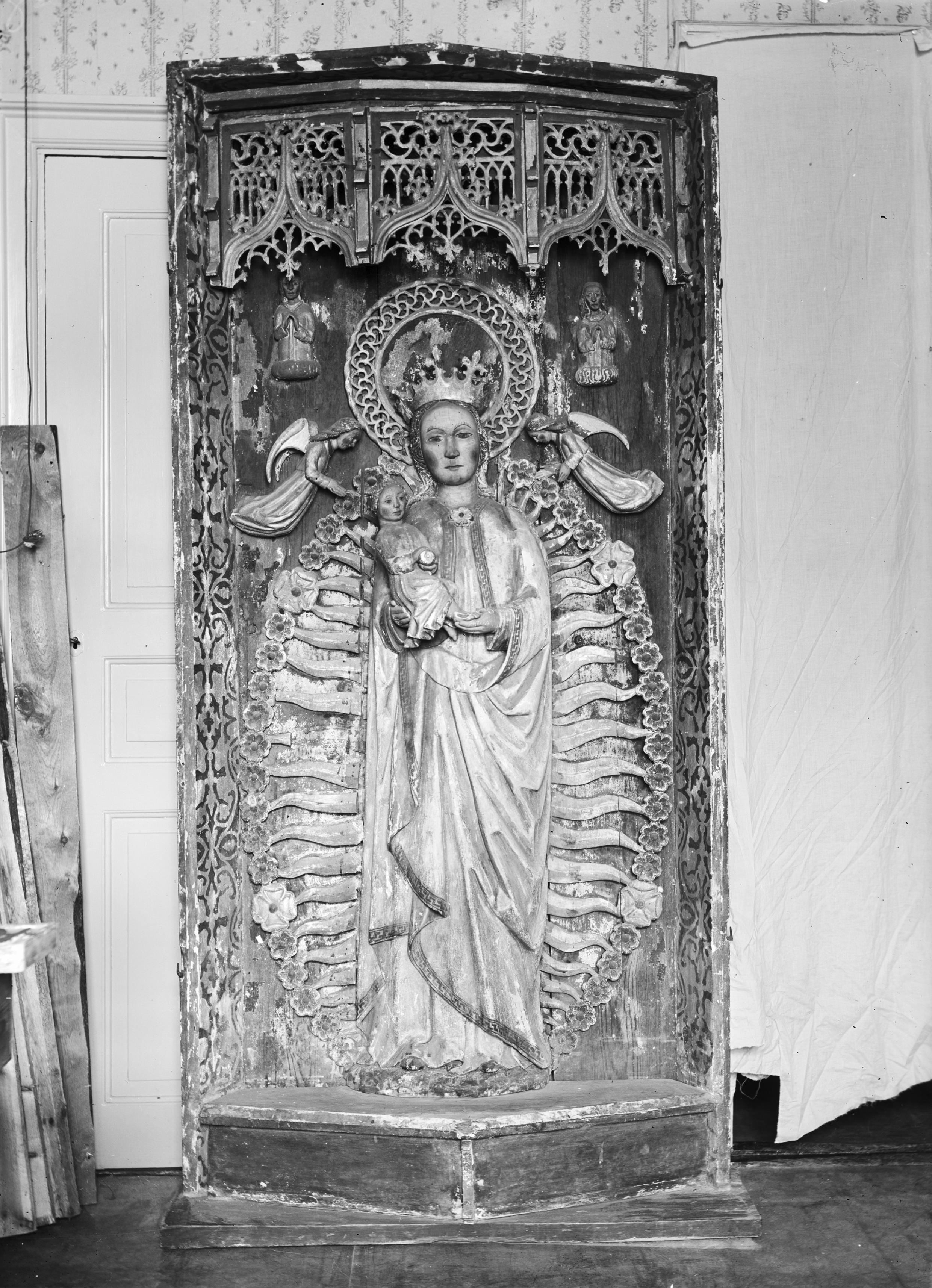 Beskrivning: Träskulptur föreställande Madonna i skåp. Omkring 1500. Före konserevring.