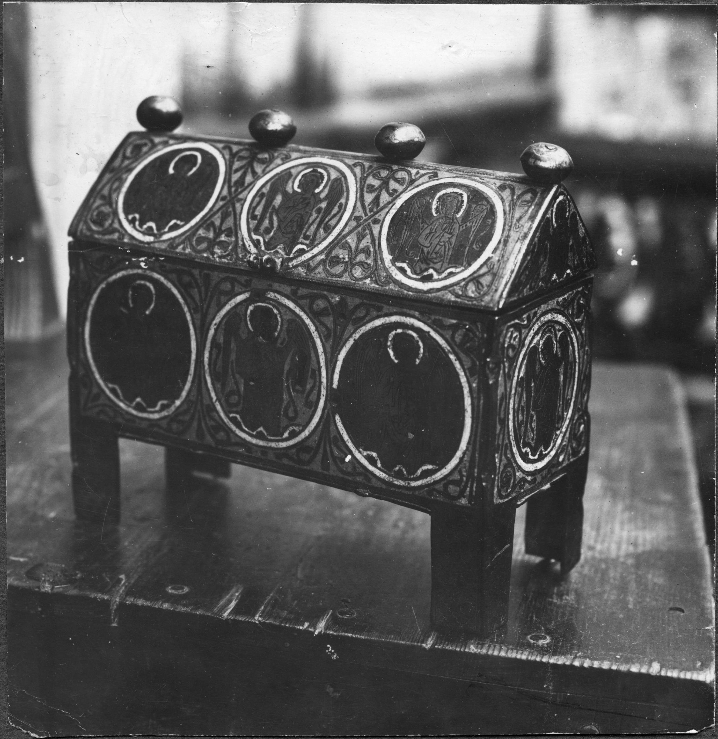 Beskrivning: Relikskrin av koppar, omkring 1200. Franskt arbete.