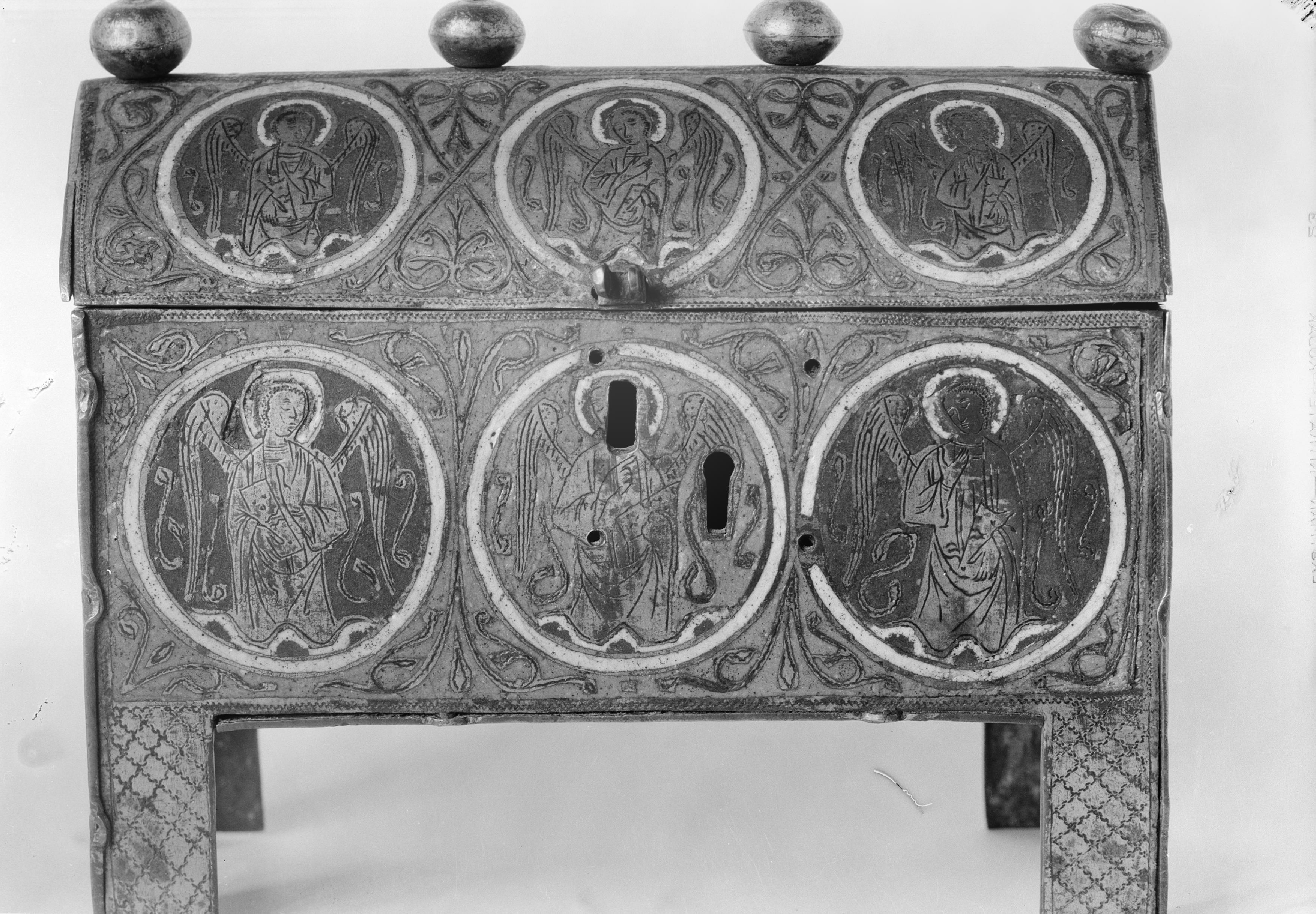 Beskrivning: Relikskrin av koppar, omkring 1200. Franskt arbete.