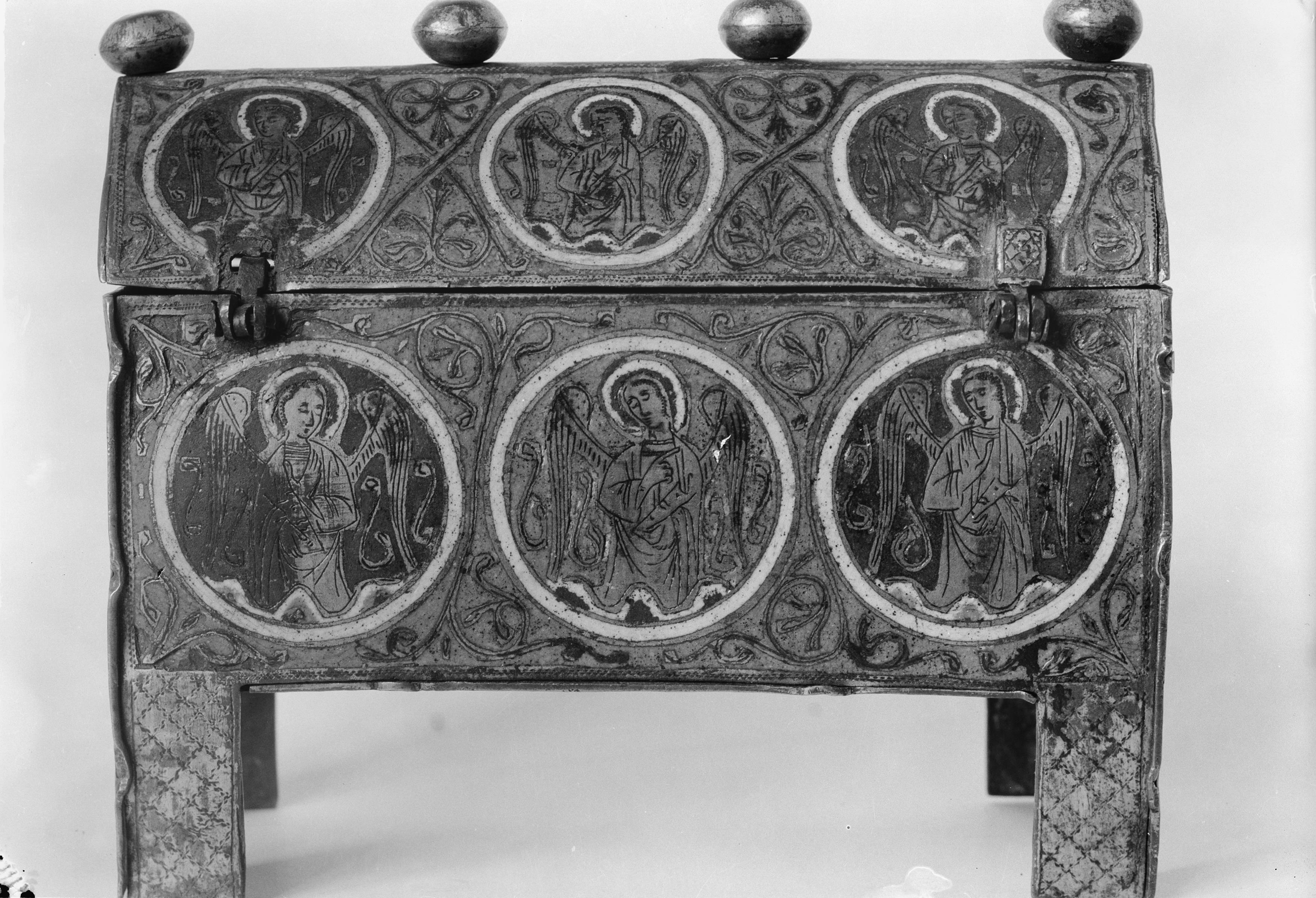 Beskrivning: Relikskrin av koppar, omkring 1200. Franskt arbete.