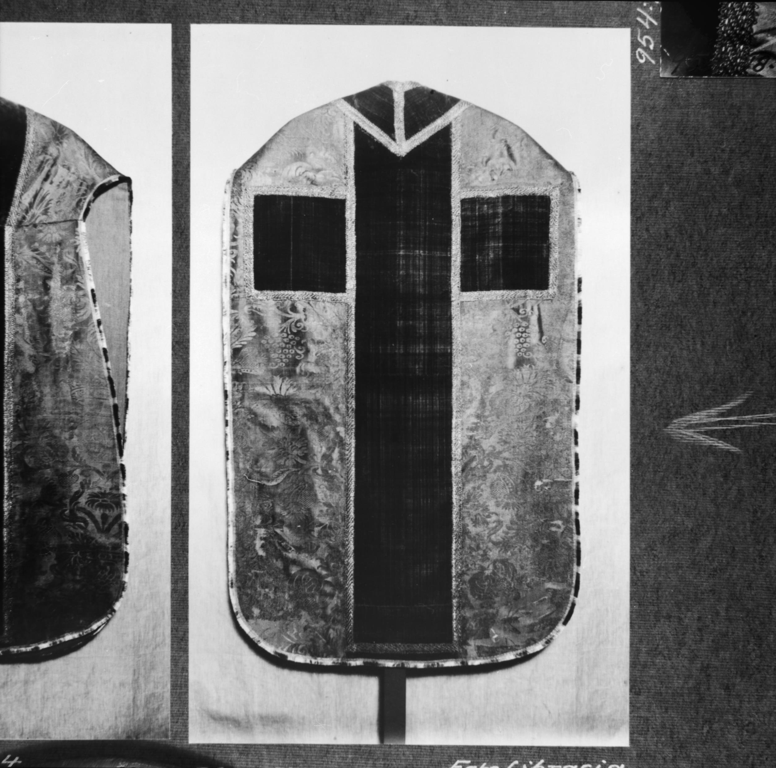 Beskrivning: Mässhake av blått siden, 1400-tal. Baksida. Efter renovering.