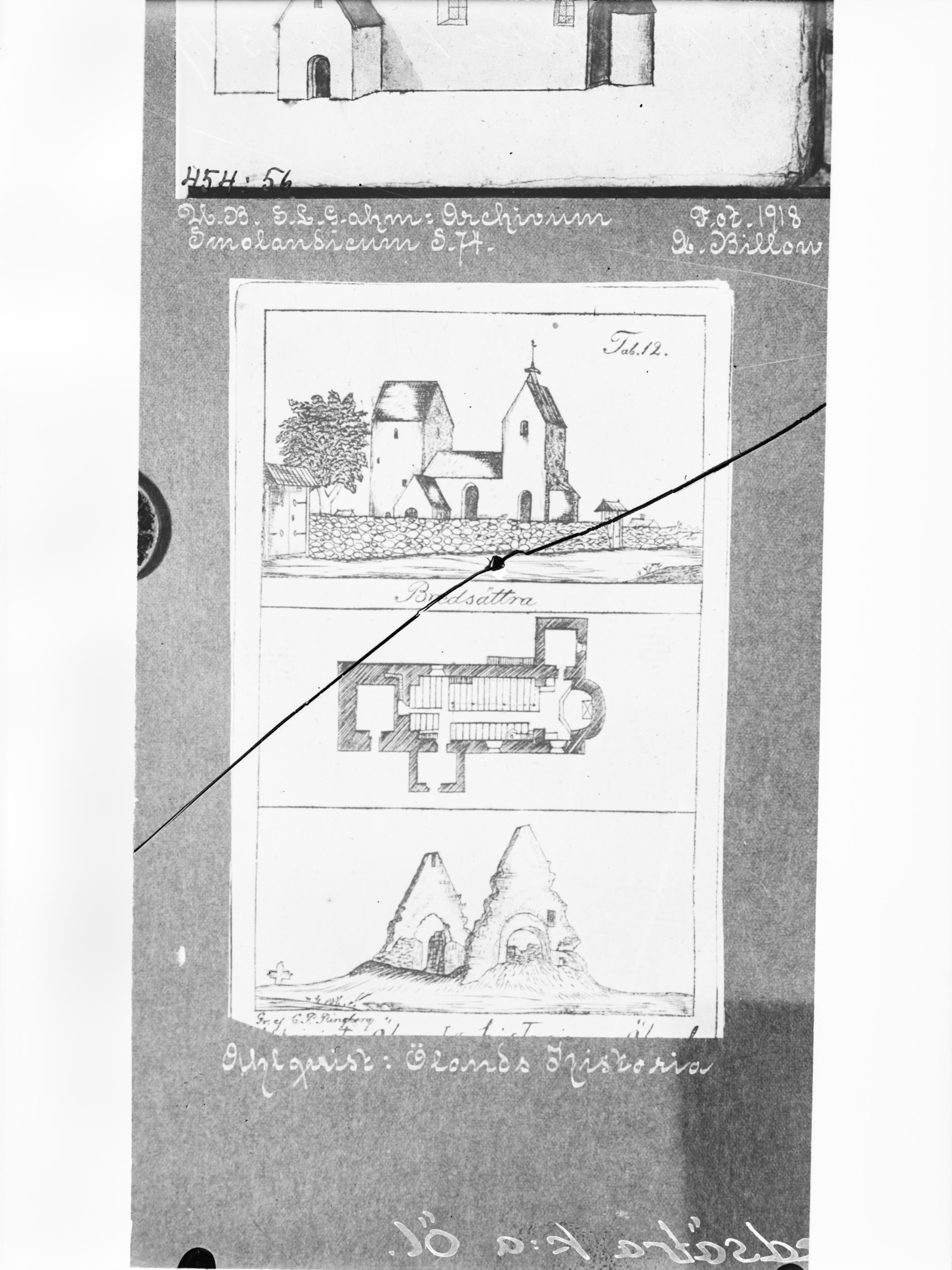 Beskrivning: Teckning av kyrkan, fasad och plan. Ur Ölands historia av Ahlqvist.